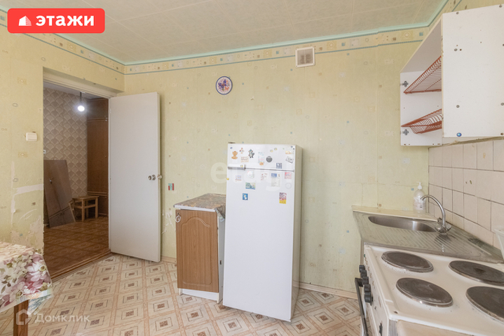 Кухня с электроплитой, холодильник и посуда.