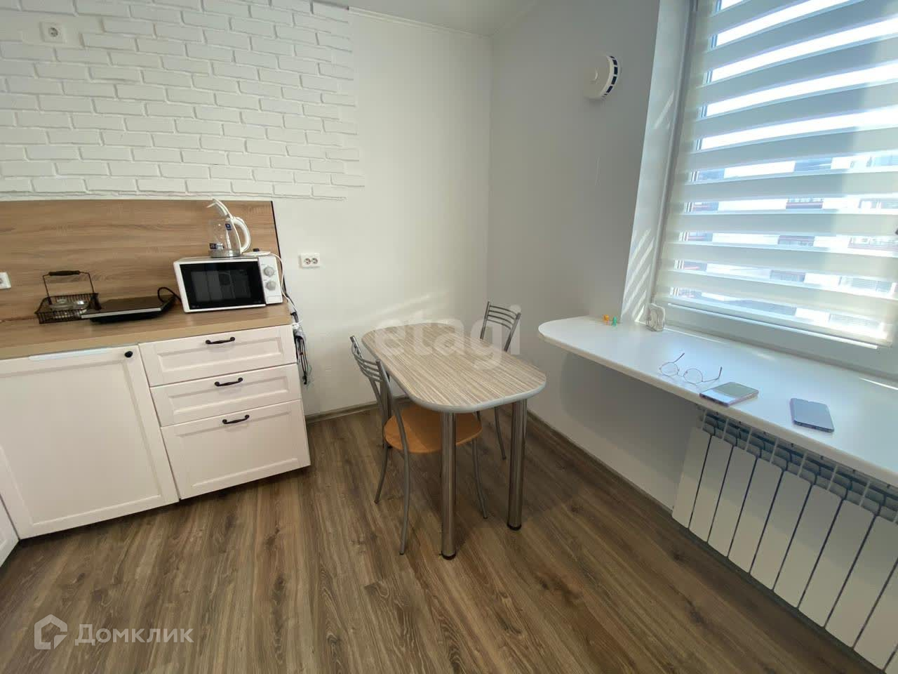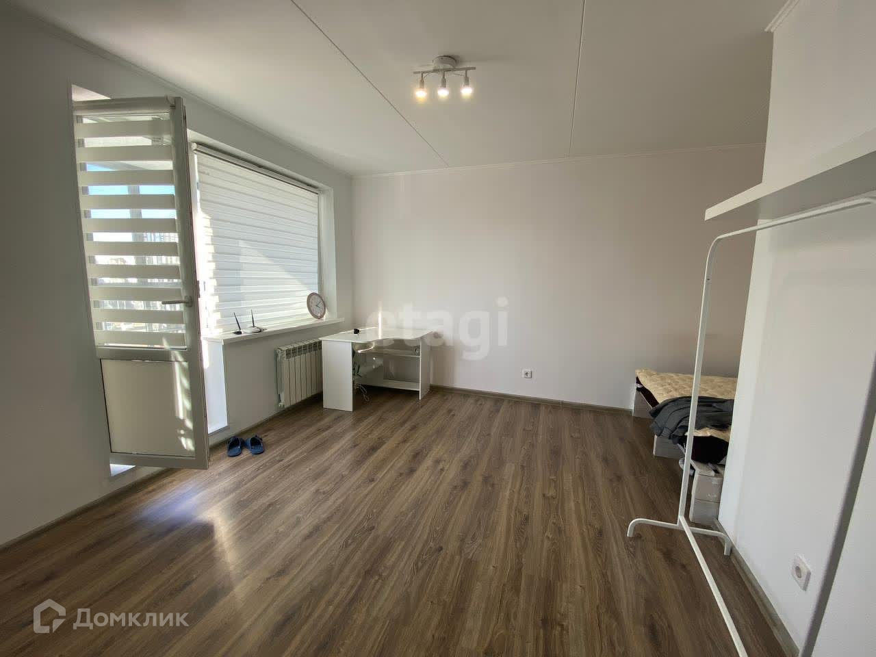 В квартире выполнен качественный ремонт, исправна сантехника, проводка и техника. Есть все необходимое для проживания - холодильник, электроплита однокомфорочная, стиральная машина, обеденный и рабочий стол, кровать с новым матрасом. Балкон застеклен.