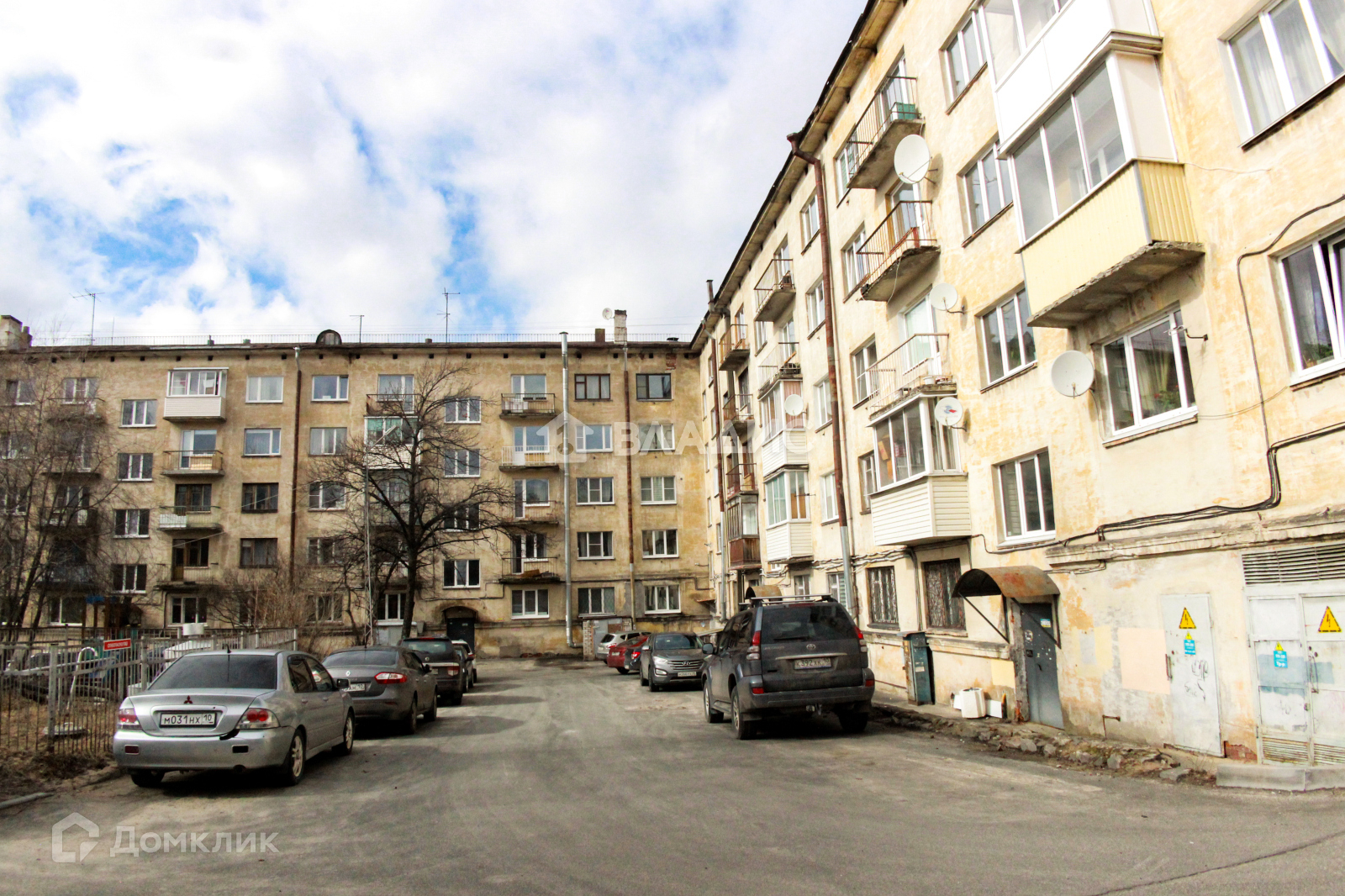 Парковка во дворе, территория ограждена шлагбаумом.