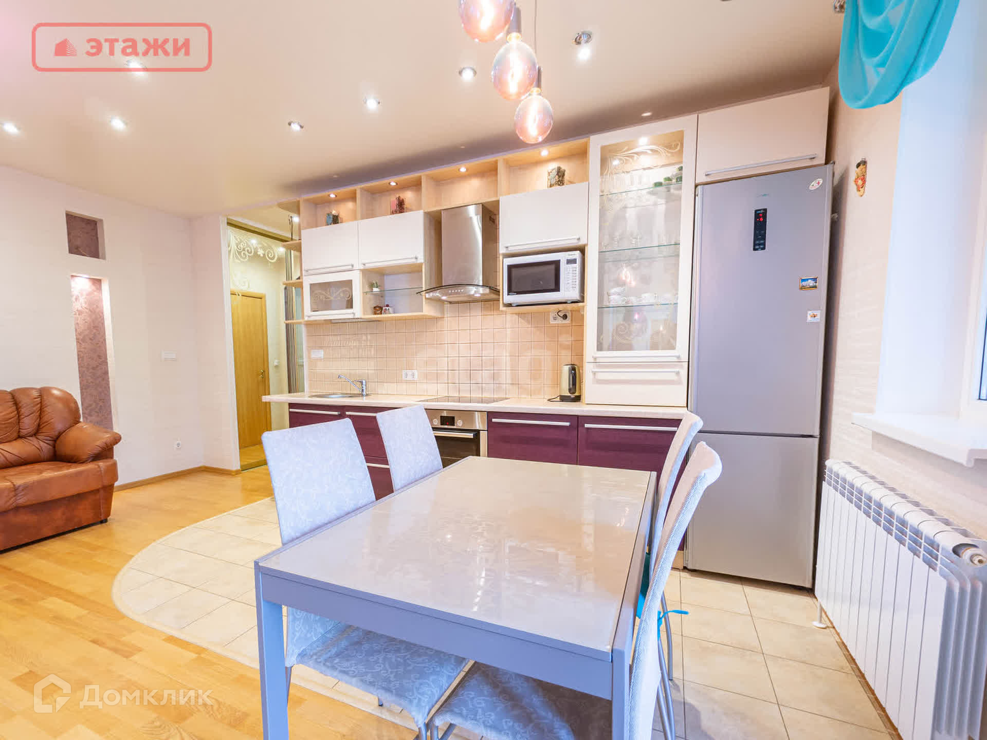 Помещение кухни эффективно дополняют вместительный холодильник и кухонный стол со стульями.