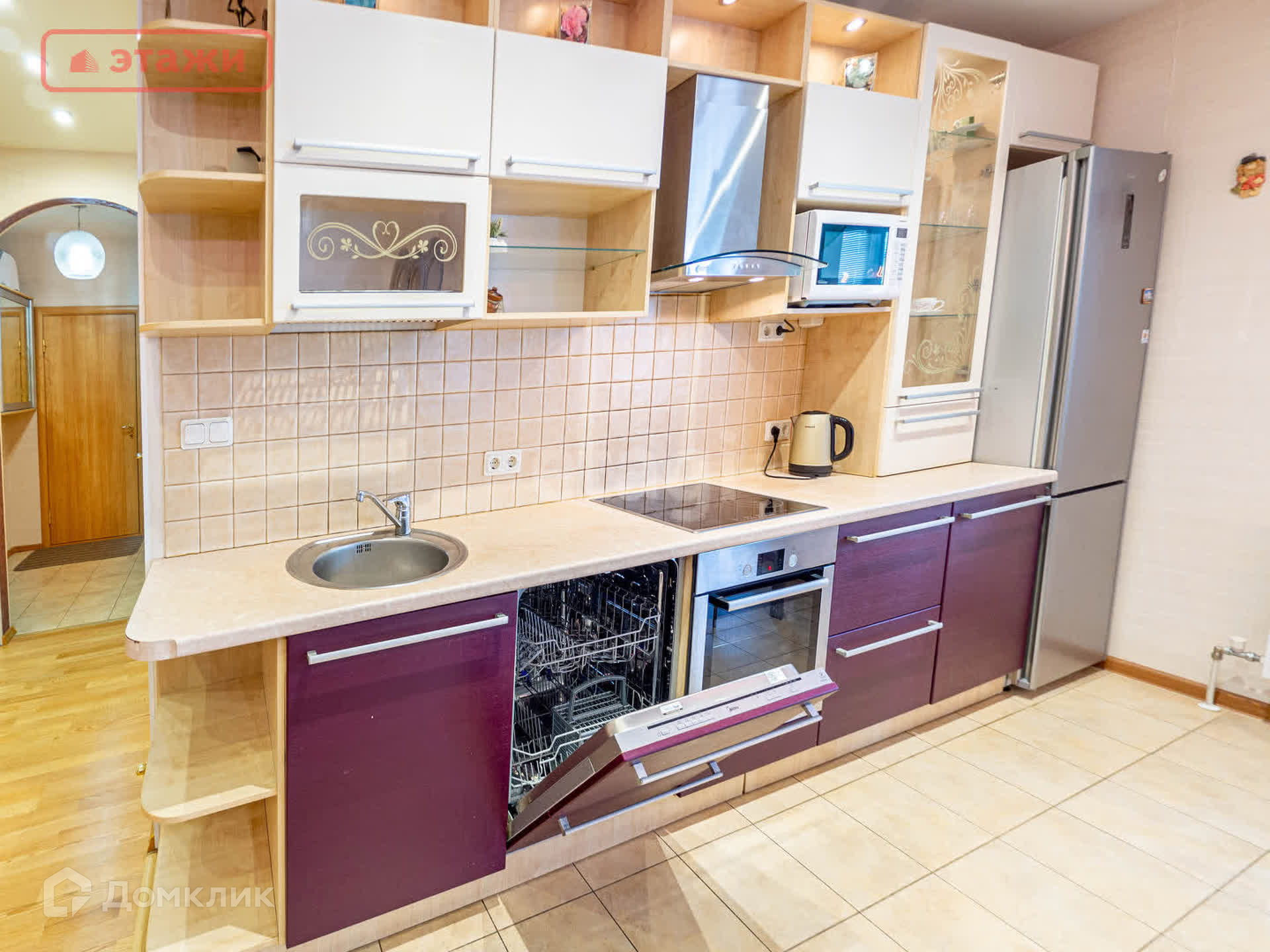 Центральное место просторной кухни 8,3 кв.м., совмещенной с гостиной 20,9 кв.м. и кабинетом 3,5 кв.м., занимает многофункциональный стильный кухонный гарнитур с широкой рабочей зоной, установлена современная встраиваемая бытовая техника (керамическая варочная панель, духовой шкаф, вместительная посудомоечная машина, вытяжка купольного типа), имеется микроволновая печь.
