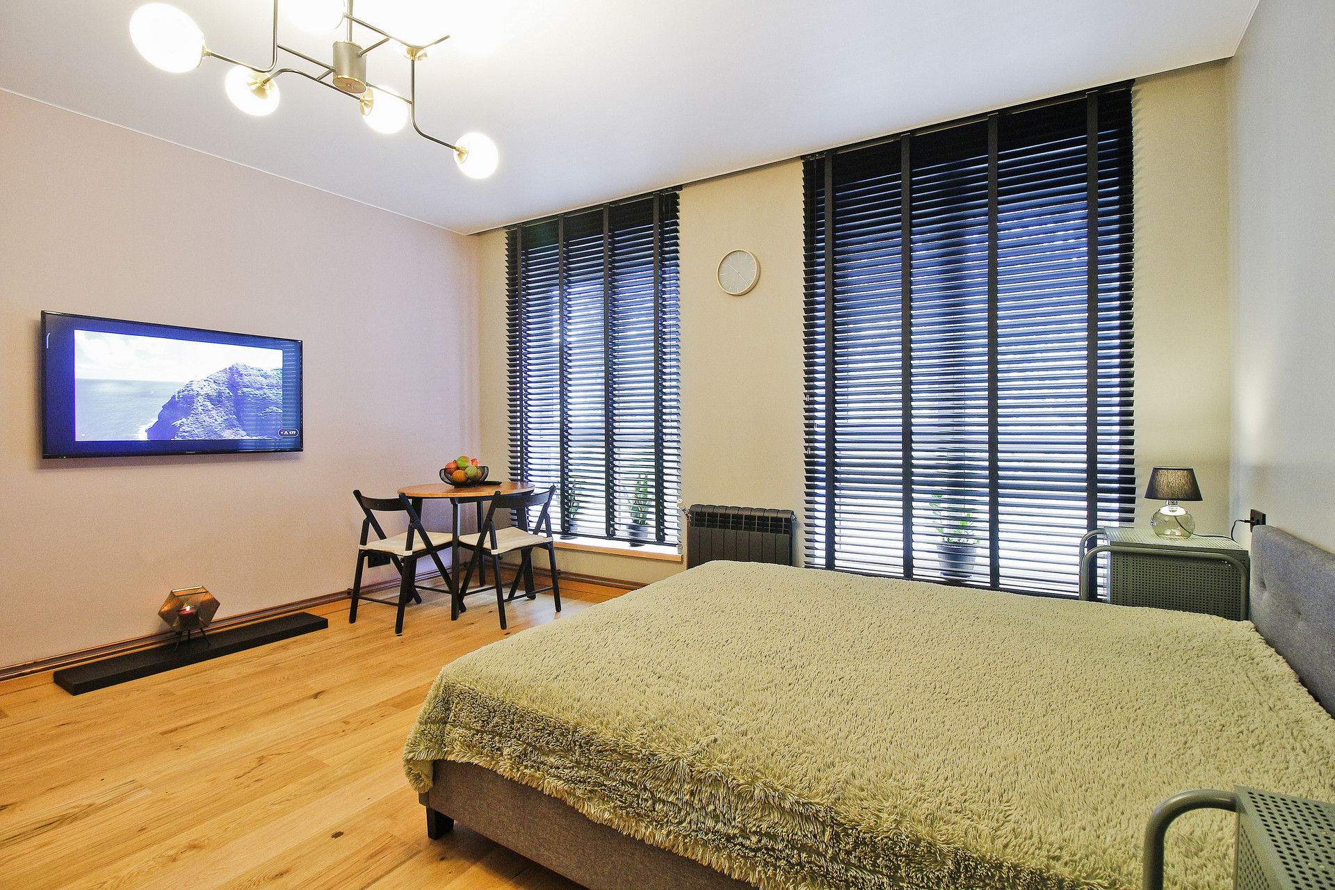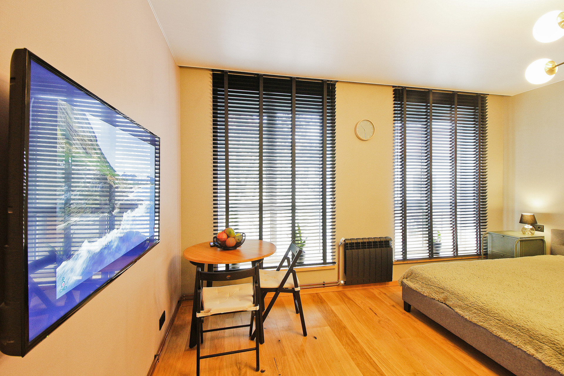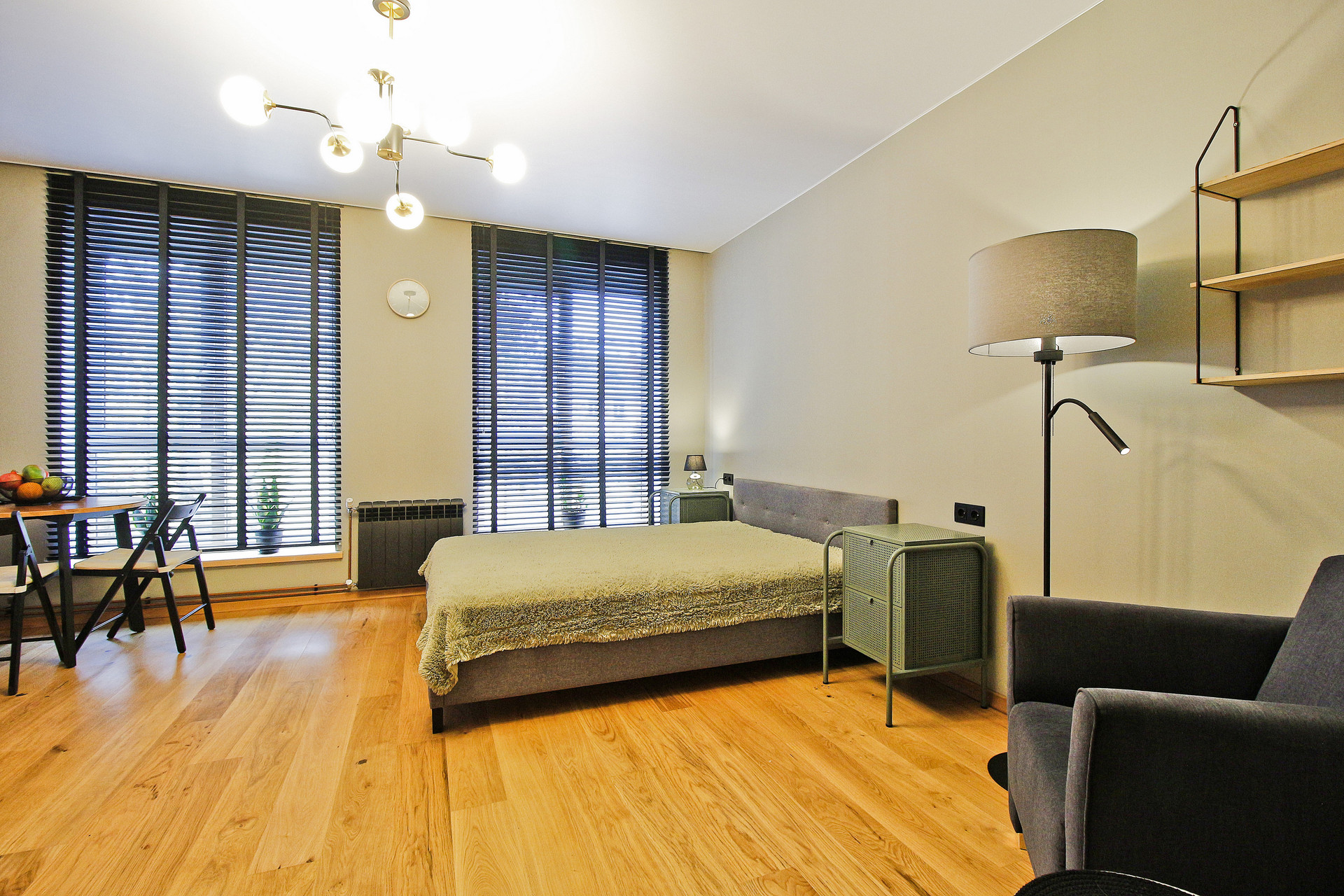 Изюминка квартиры - два огромных панорамных окна в пол со стильными жалюзи. Их можно плотно закрыть, отгородившись от улицы, или открыть и любоваться закатом - это западная сторона!