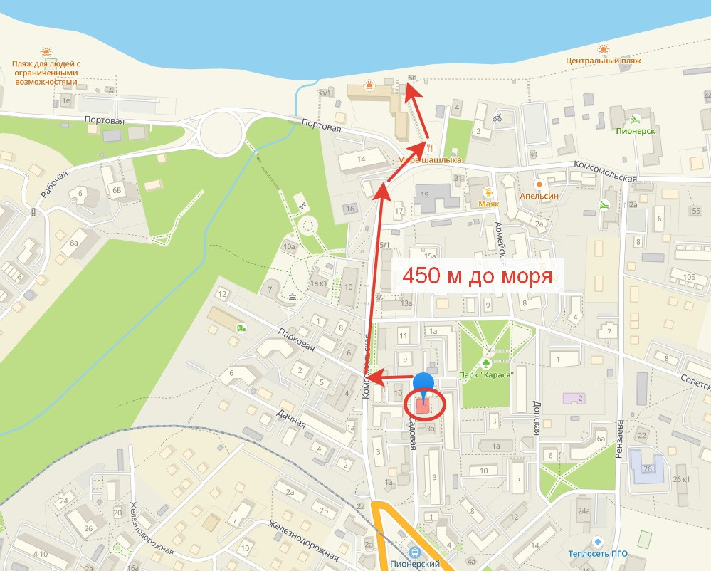 Локация дома - самая топовая в городе. Это самый центр - до ж/д и автовокзала - 100 метров, до супермаркета Спар - 80 метров, до рынка - 150 метров, до спуска к морю и променаду - 400 метров. При этом дом находится в секторе малоэтажной застройки не у шумной трассы.