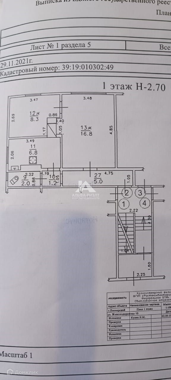 2-комнатная квартира, 40 м2, этаж 1 / 2, на продажу в Пионерском, Железнодорожная улица, 10