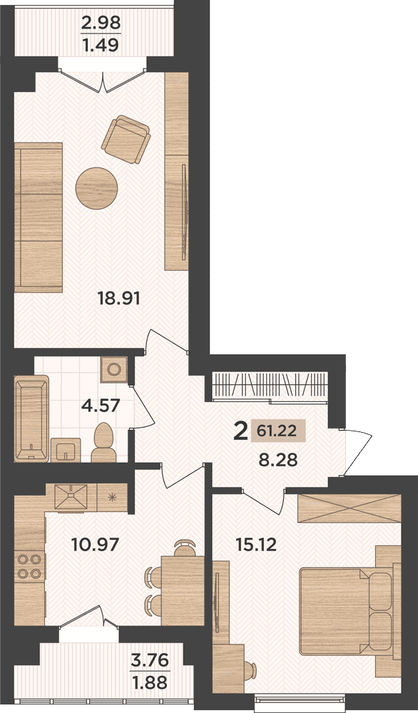 ✅ 2-к. Квартира  59.1 кв.м с просторными  солнечными комнатами , есть балкон и лоджия !