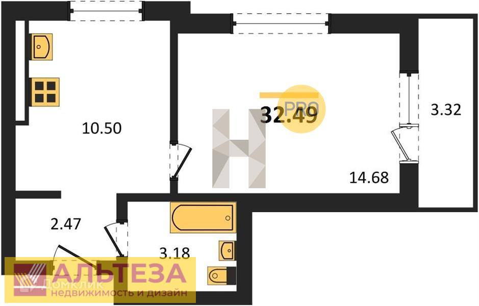 Квартира находится на 1 этаже 6 этажного дома, 2023 г.п . квартира общей площадью 32,49 кв. м , комната 14,68 кв. м, кухня 10,5 кв. м, санузел совмещенный 3,18 кв. м , есть балкон 3,32 кв. м, выход на который из комнаты. Квартира без отделки , в сером ключе с автономным отоплением ( установлен газовый двухконтурный котел ), установлены приборы учета воды, газа, электричества. Высота потолков 2,7 м.