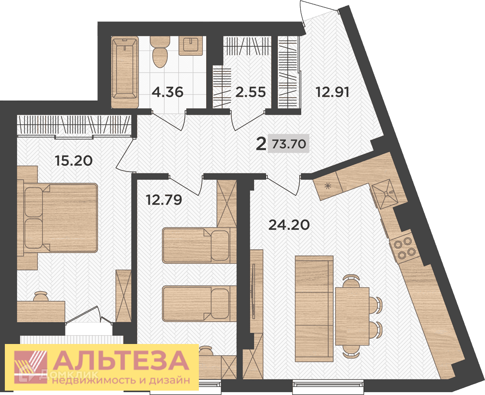 Квартира на 1 этаже 6-тиэтажного дома. Общая площадь 73,7 кв. м., комнаты 15,2/12.79 кв. м., кухня -гостиная- 24,2 кв. м., совмещенный санузел, гардеробная. В квартире имеется лоджия.