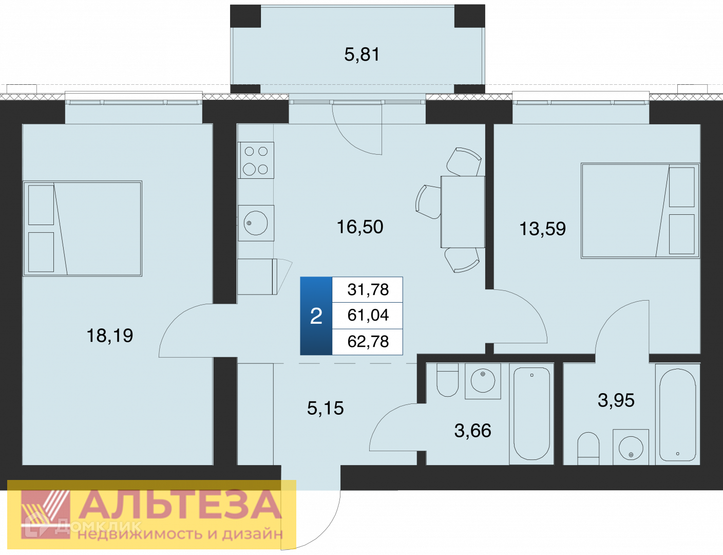 , Пионерский г, Октябрьская улица 6Б, 2 комн., общ. пл. 62.78 кв.м., жил.пл. 31.78 кв.м., комнаты 18.19/13.59, кухня 16.5 кв.м., 1/4 этаж, окна двор, 2 санузла, балкон, без отделки, Номер лота: 4231575