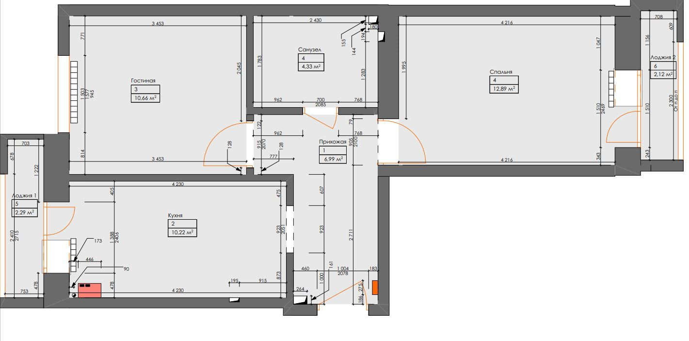 Общая площадь 43.7 м2