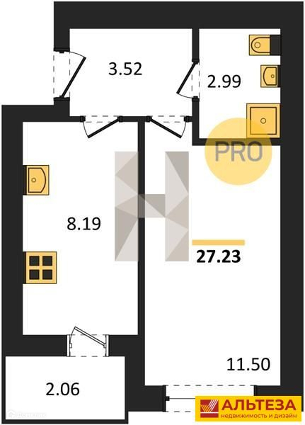 Квартира находится на 2 этаже 6 этажного дома, 2023 г.п . квартира общей площадью 27,23 кв. м , комната 11,5 кв. м, кухня 8,19 кв. м, санузел совмещенный 2,99 кв. м , есть шикарная лоджия 2,06 кв. м ( 1,03 ), выход на которую из кухни . Квартира без отделки , в сером ключе с автономным отоплением ( установлен газовый двухконтурный котел ), установлены приборы учета воды, газа, электричества. Высота потолков 2,7 м.