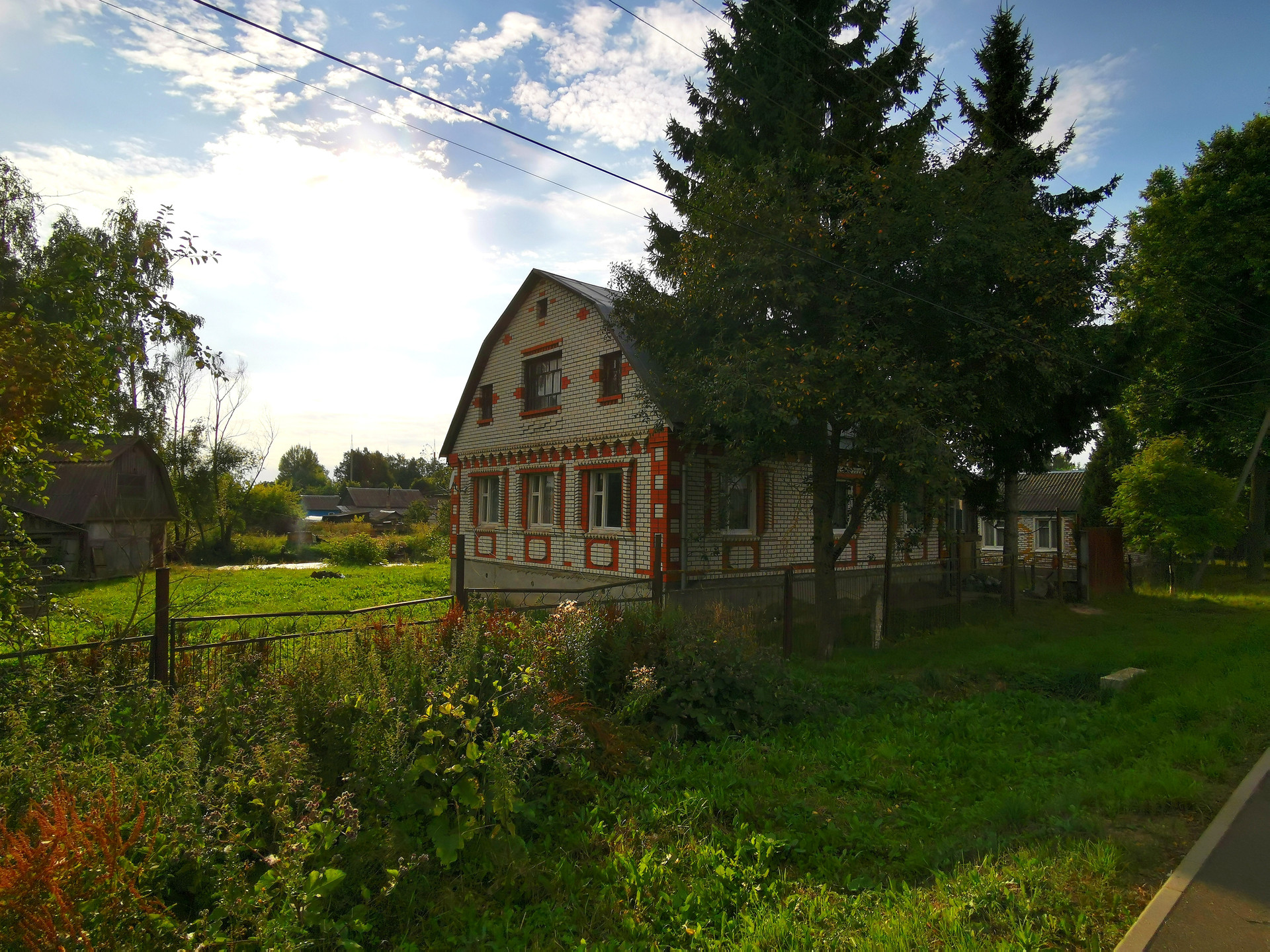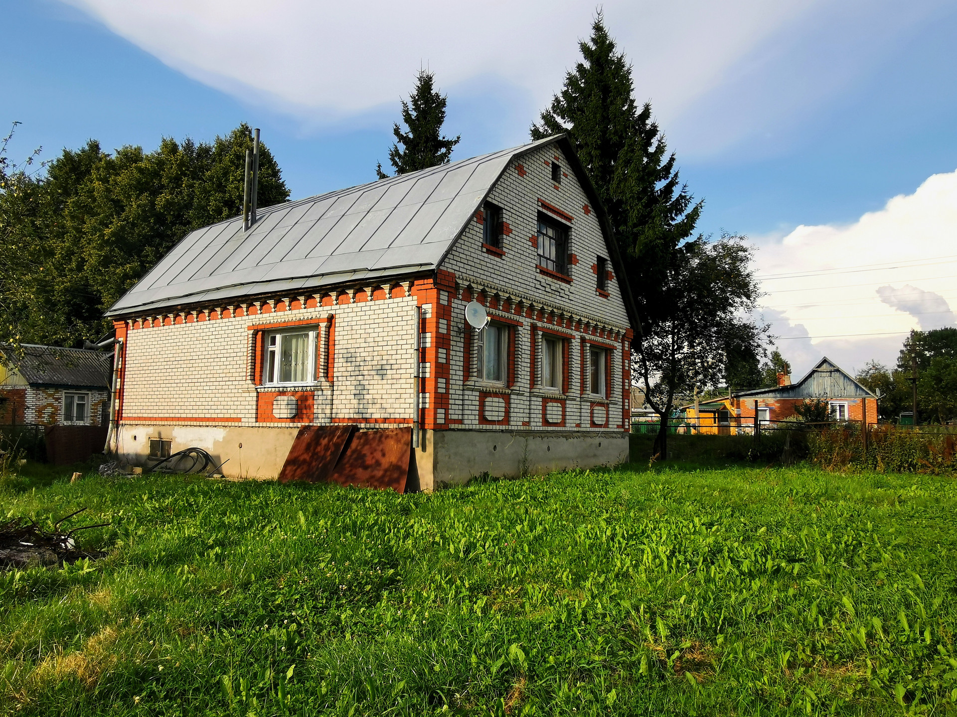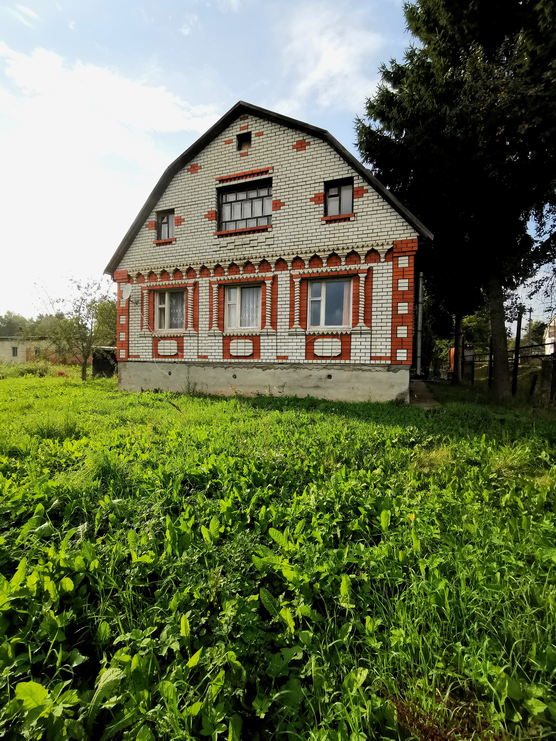 Высокий фундамент, большой подвал, большая мансарда. Большие окна, высокие потолки - 2.8м. На участке водоем, хозяйственные постройки, гараж.