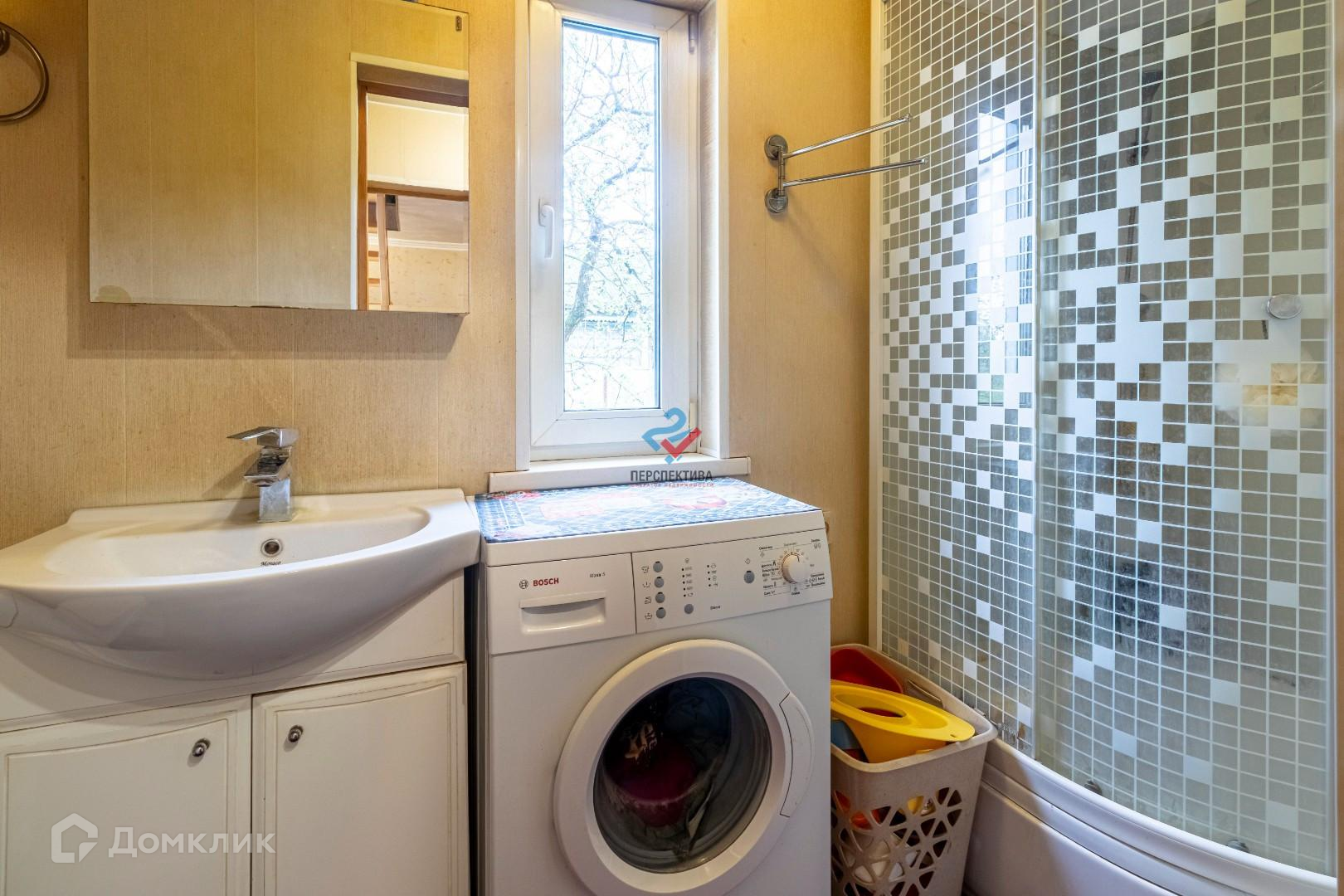 - в ванной душевая кабина, современная стиральная машина,