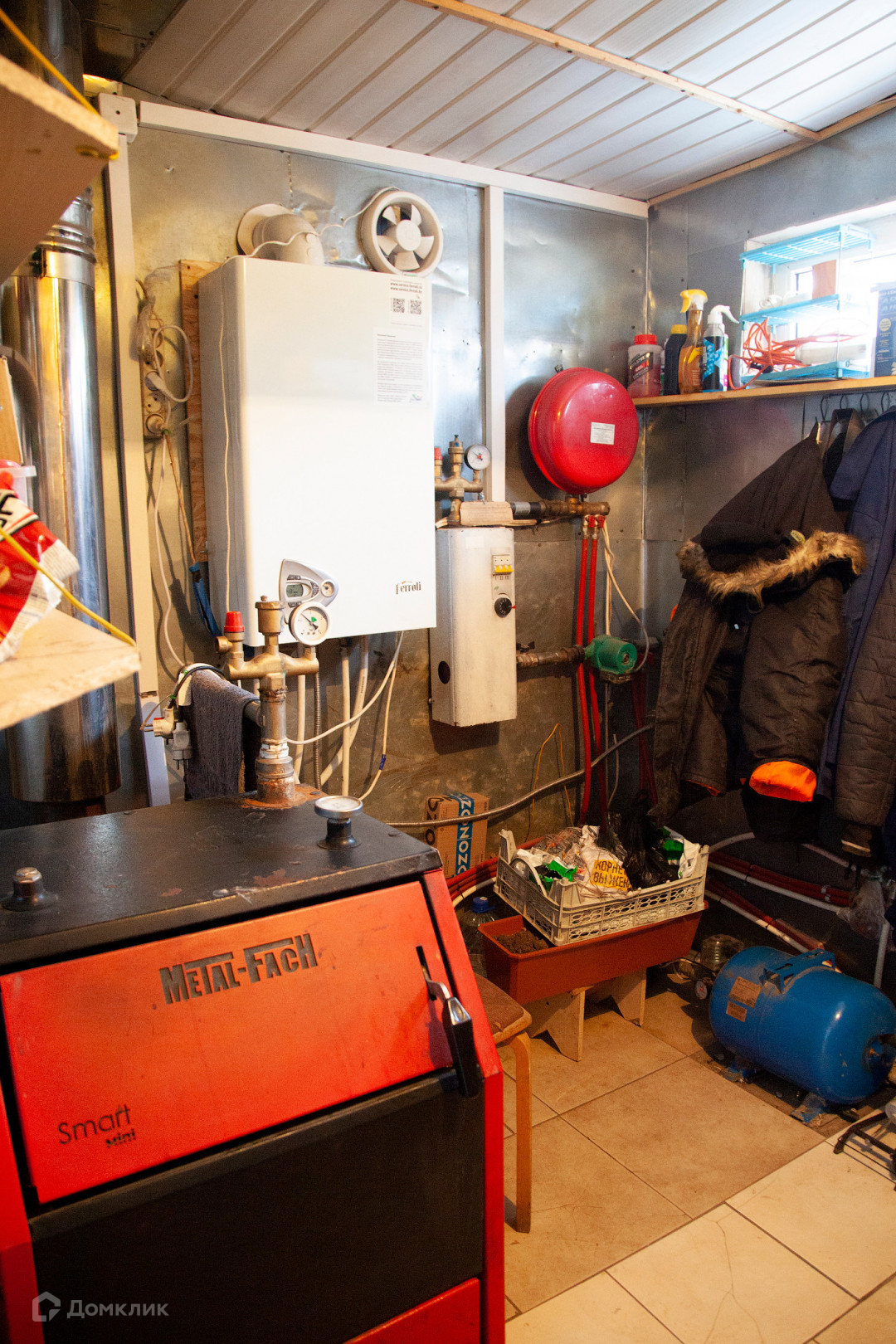Отопление и горячая вода от газового двухконтурного котла (Итальянский Ferroli). По отоплению и по горячей воде есть резервное дублирование дополнительными электрическим и твердотопливным (импортный Metall-Fach) котлами. Новейшая современная автоматика котлов позволяет устанавливать выбранный режим отопления дома.