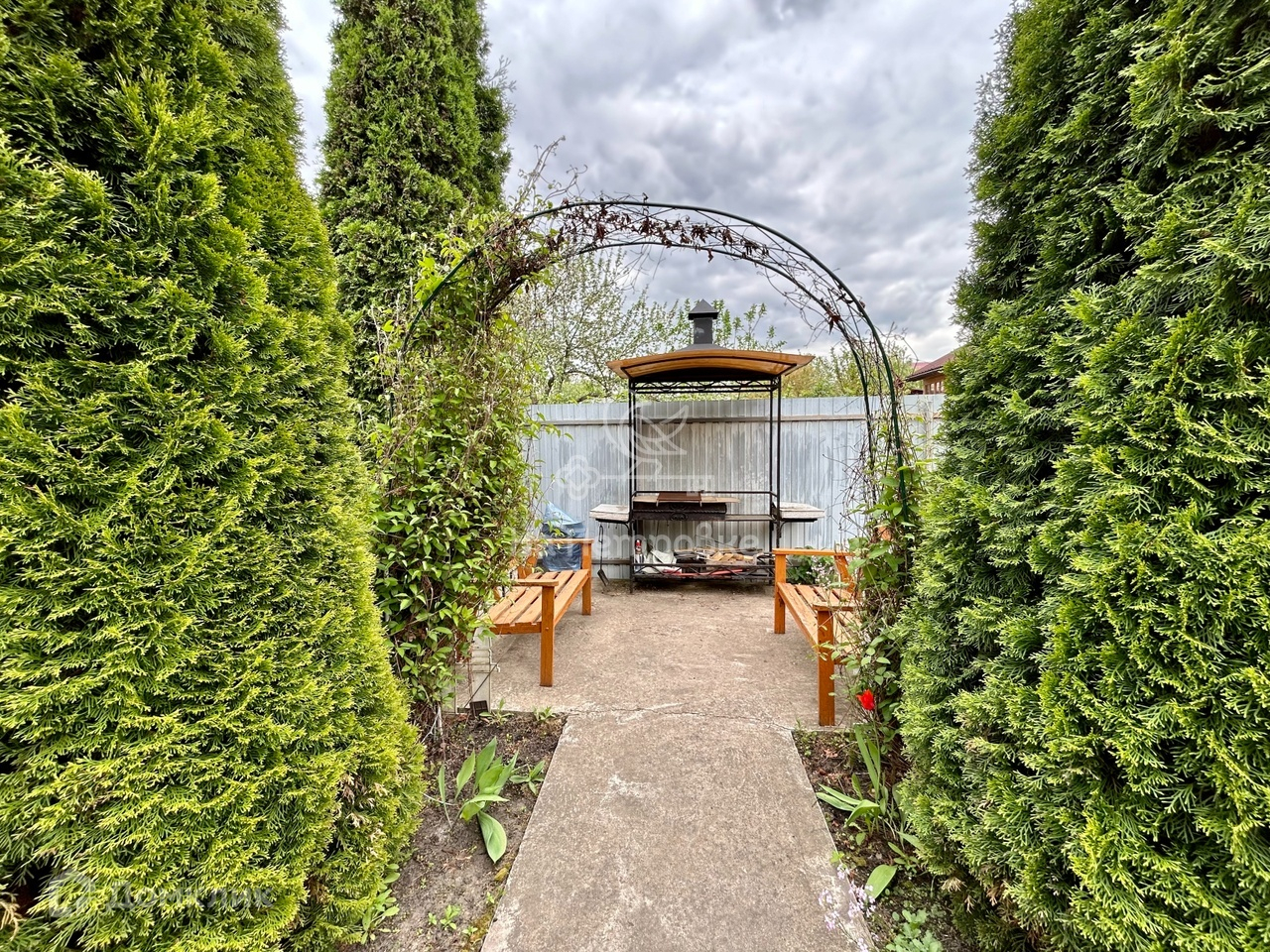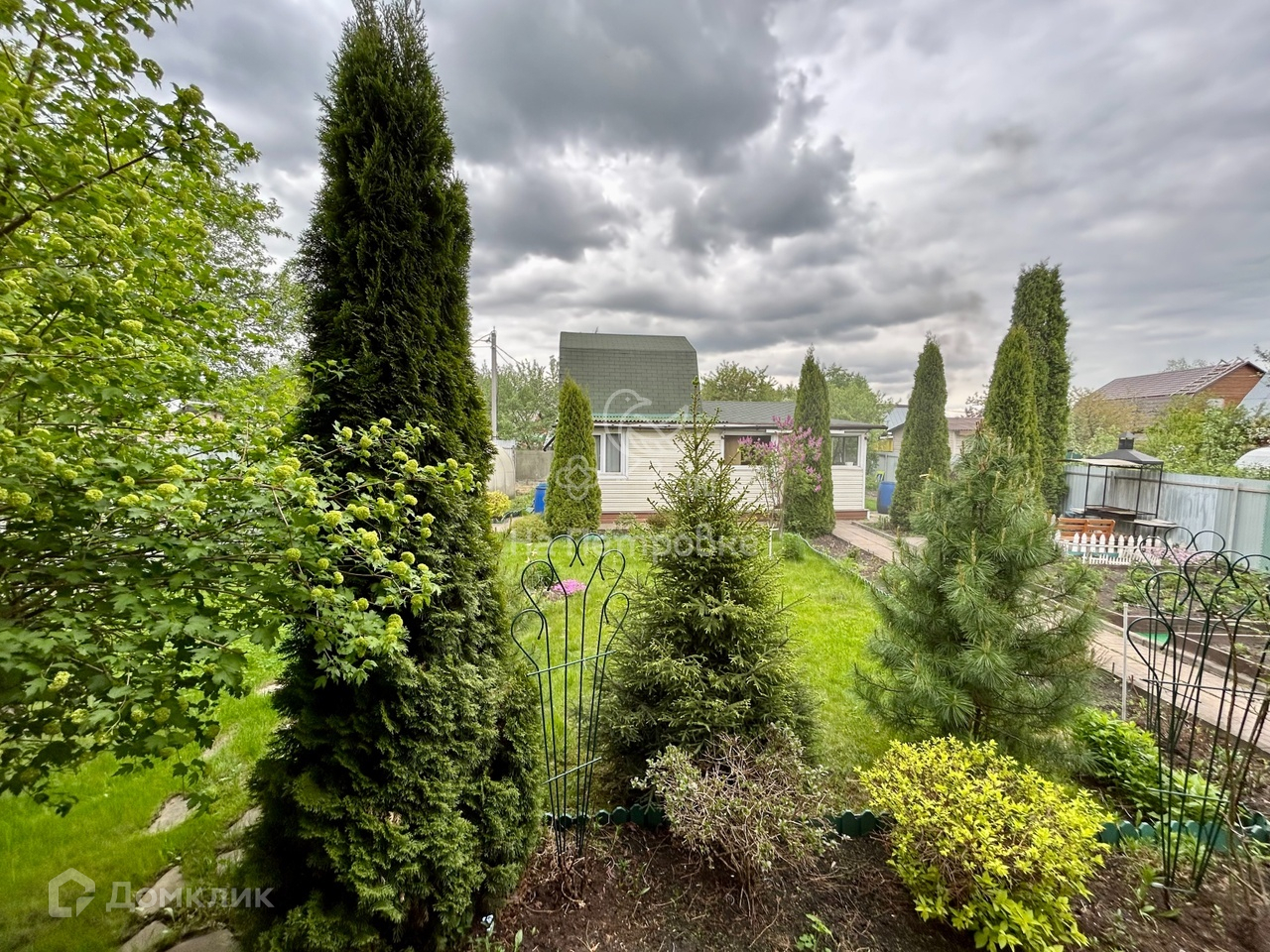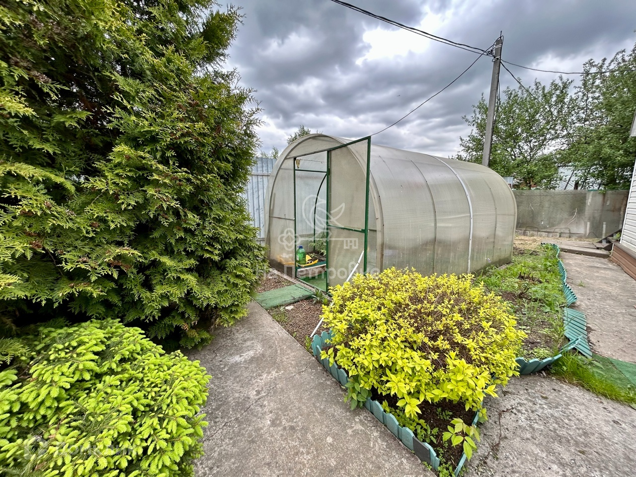 Очень ухоженный зеленый участок с кедровыми соснами. Есть парник, плодовые деревья и кустарники, грядки, газон, площадка для парковки 2-3 автомобилей, зона барбекю и цветники, хозблок.