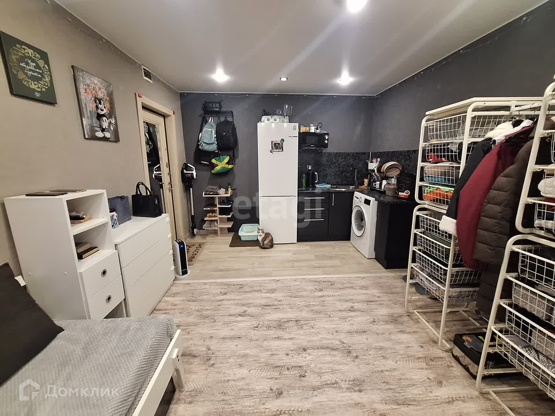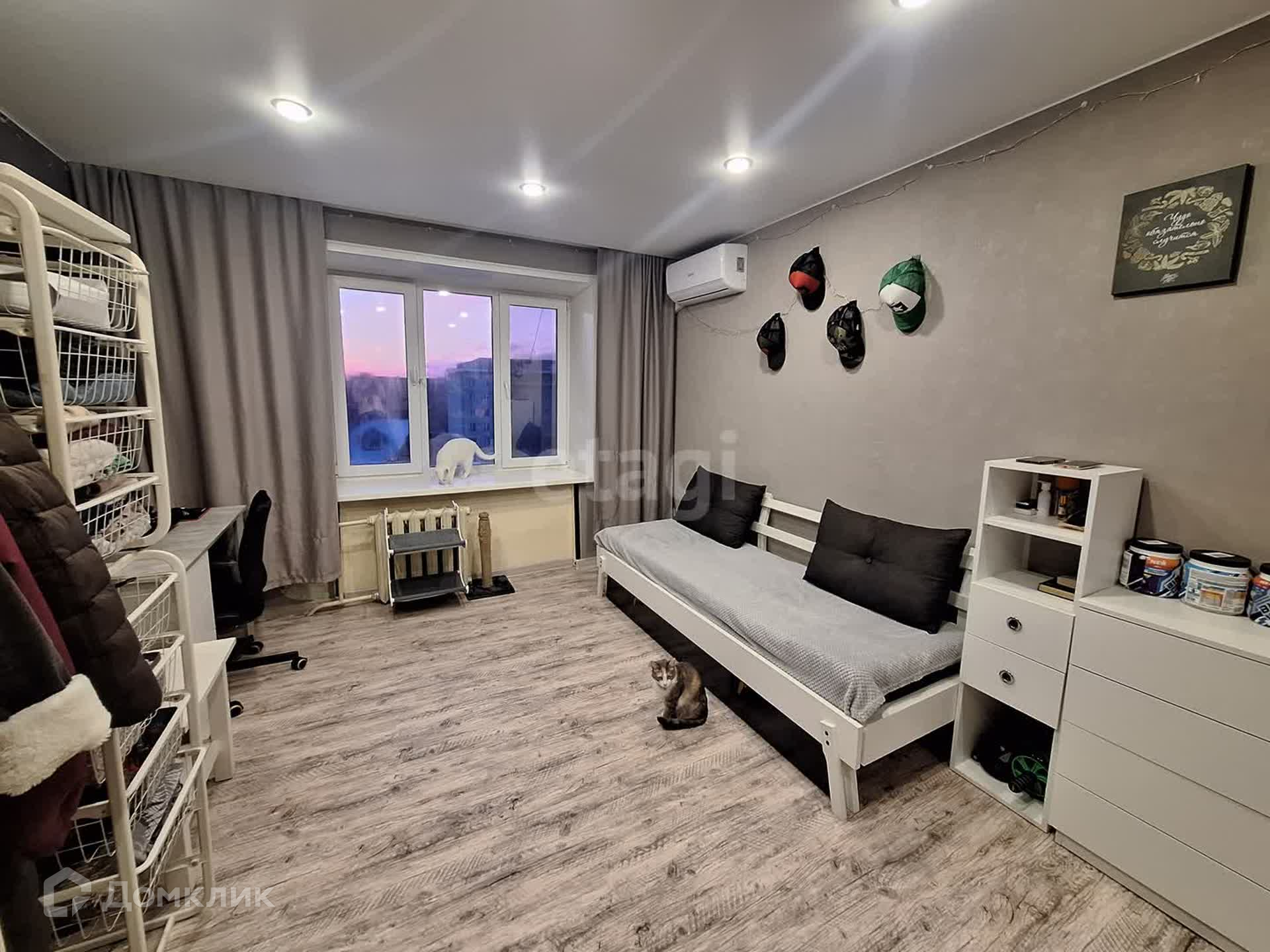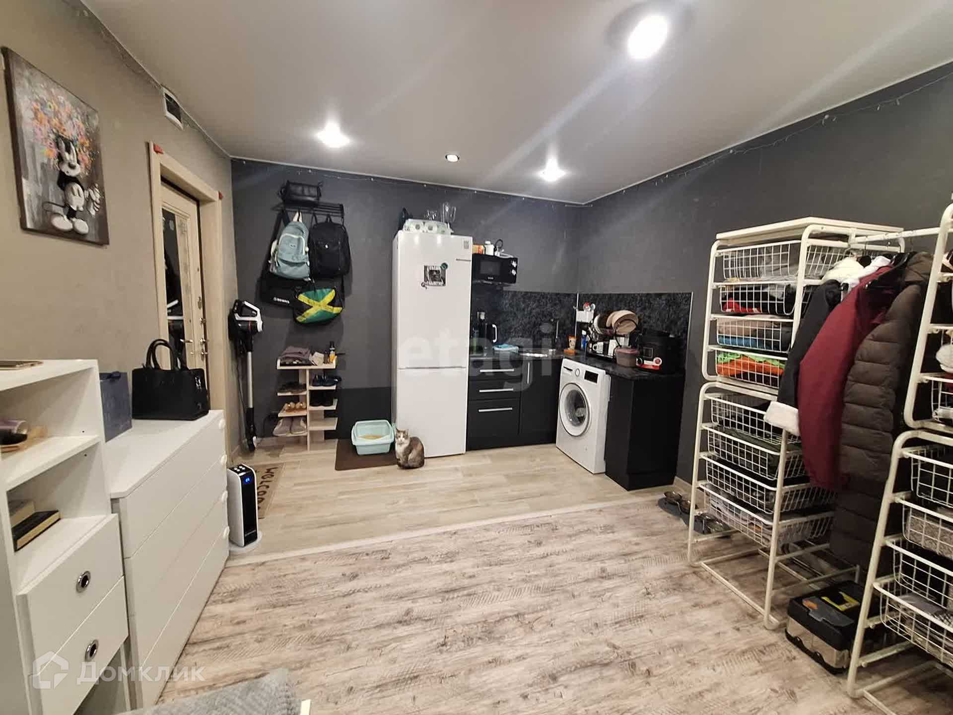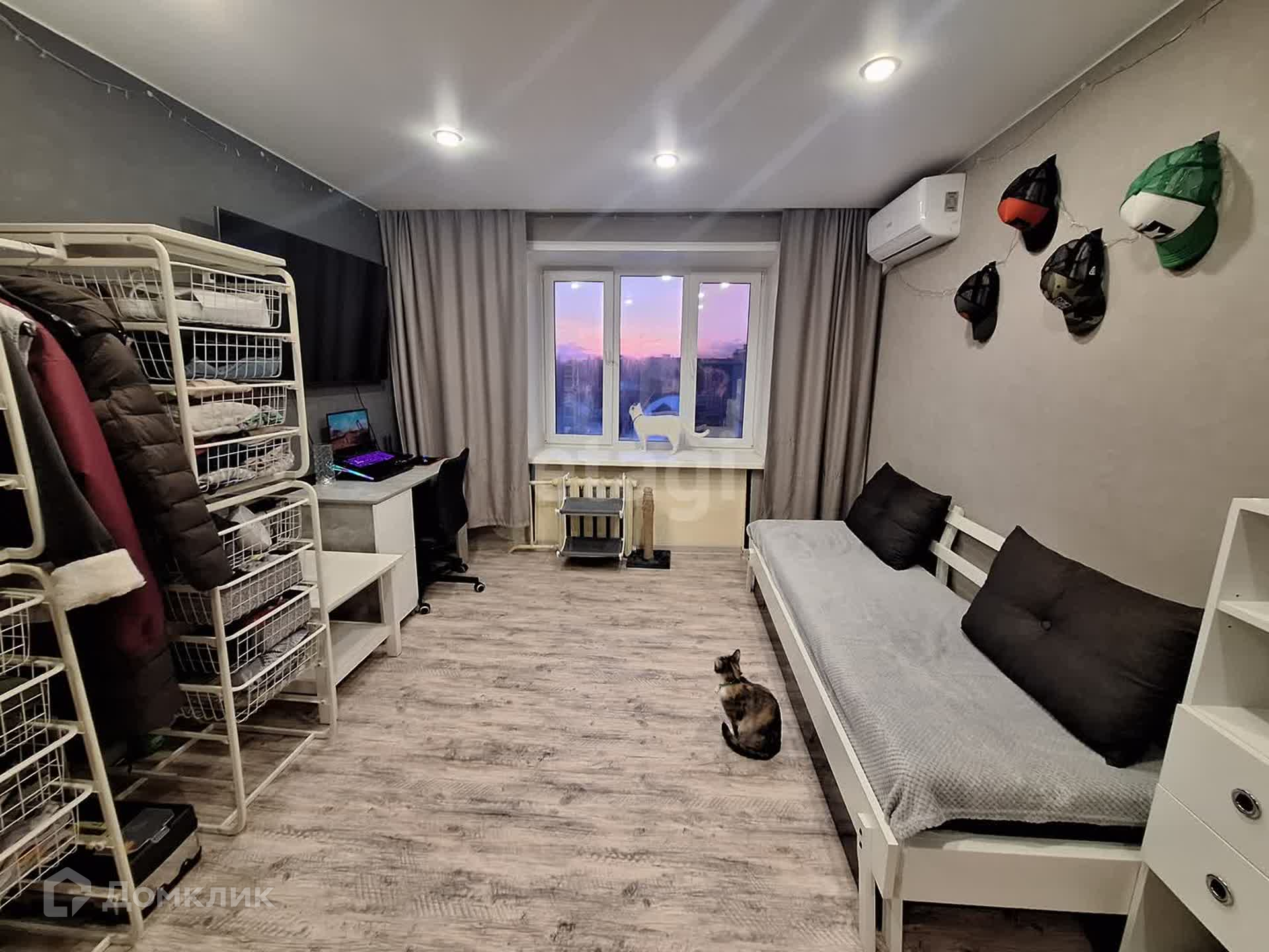 Поменяна вся проводка. В комнату заведена вода, установлен свой кухонный гарнитур. Установлен кондиционер и железная дверь.