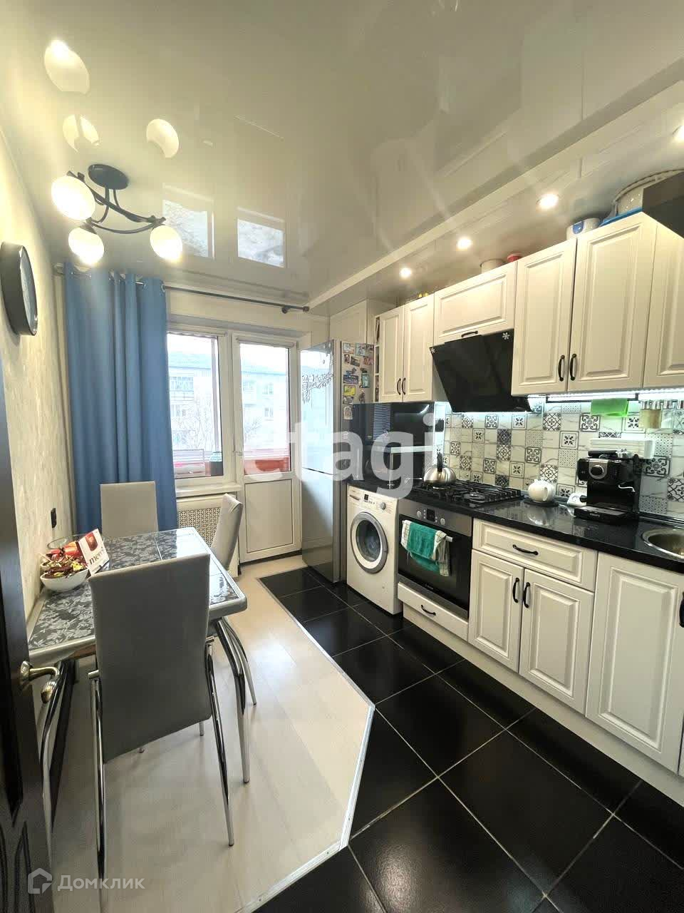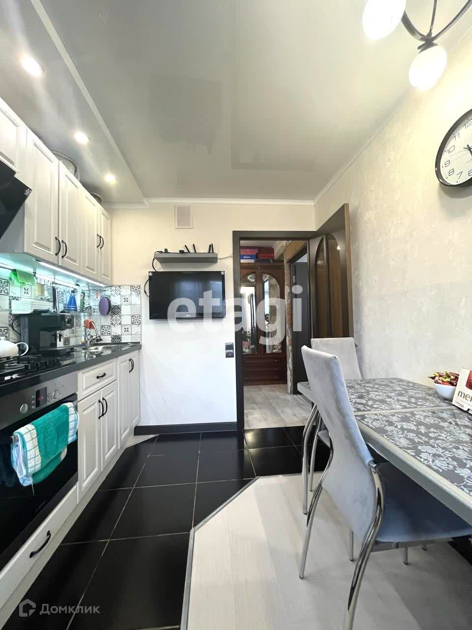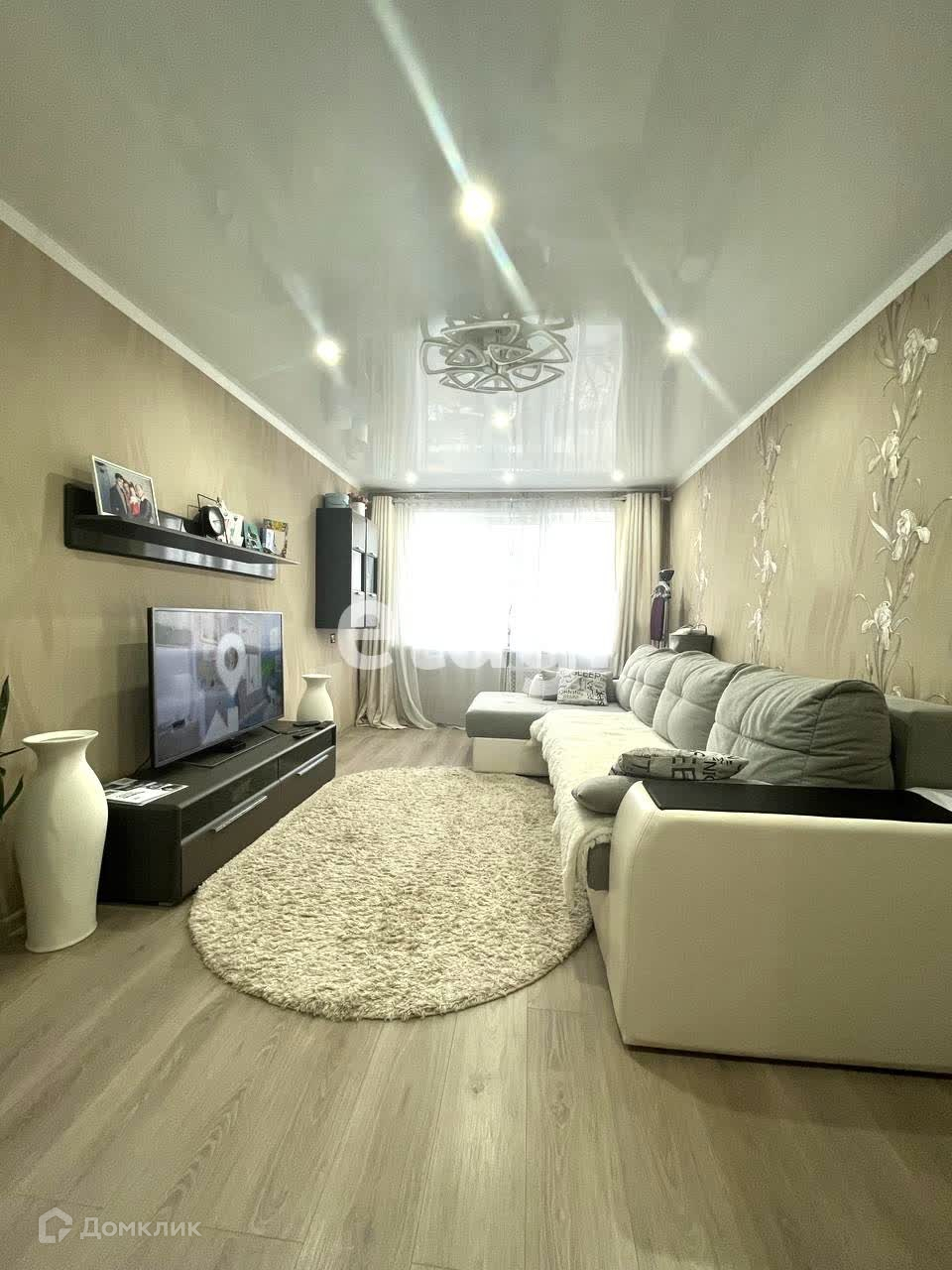 В комнатах и кухне - натяжной потолок, на полу - ламинат, в кухне - часть выложено плиткой - рабочая зона.
