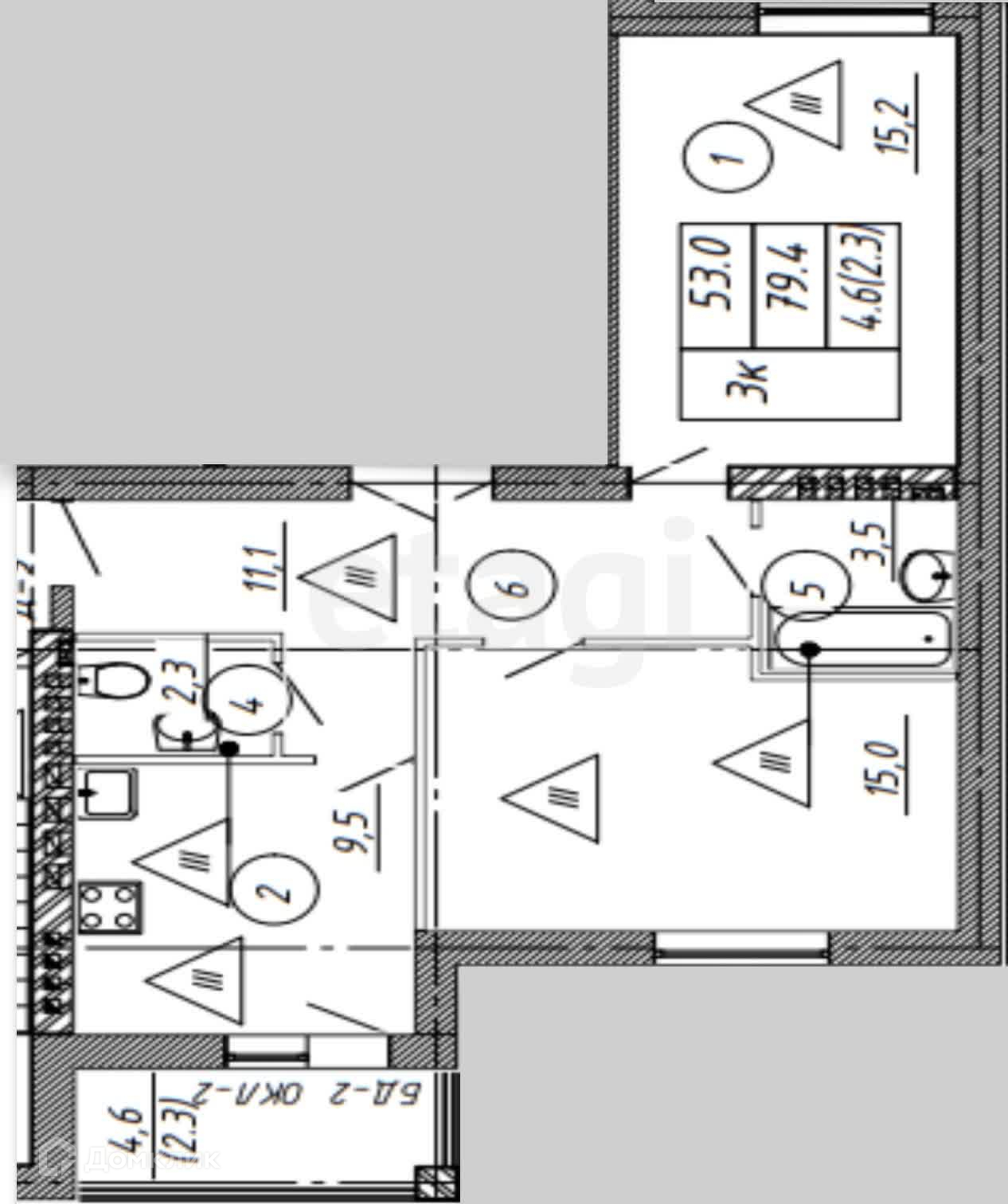 Общая площадь 58.4 кв.м. Площадь кухни - 9.5 кв.м. Выход из кухни на балкон площадью - 4,6 кв.м., комнаты просторные изолированные 15 и 14.7 кв.м, санузел раздельный.