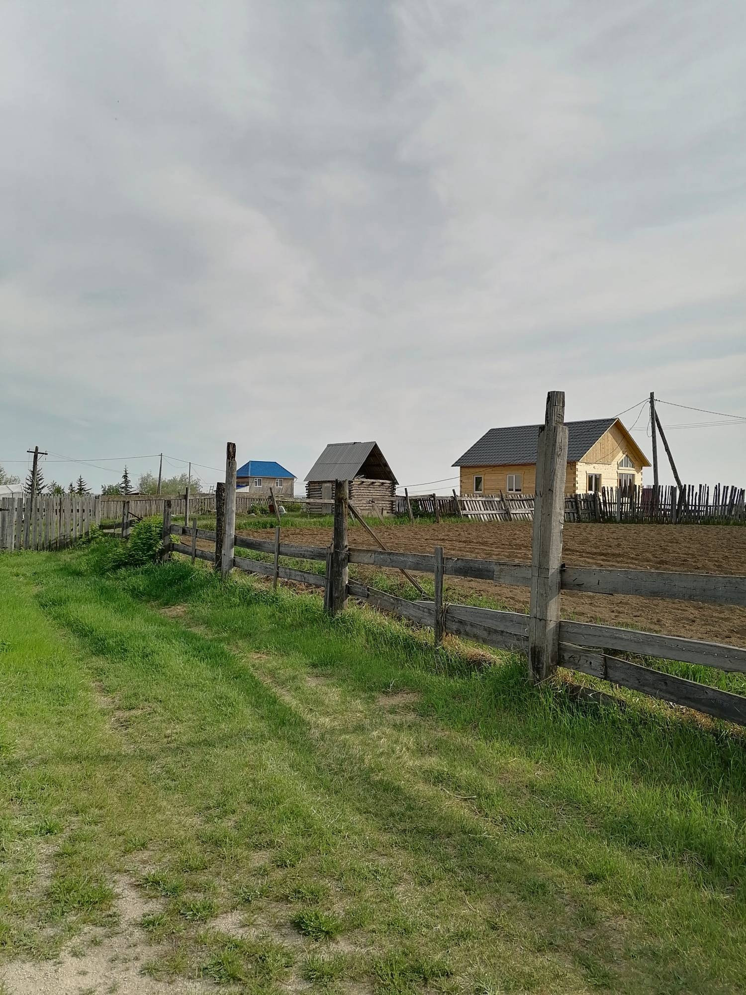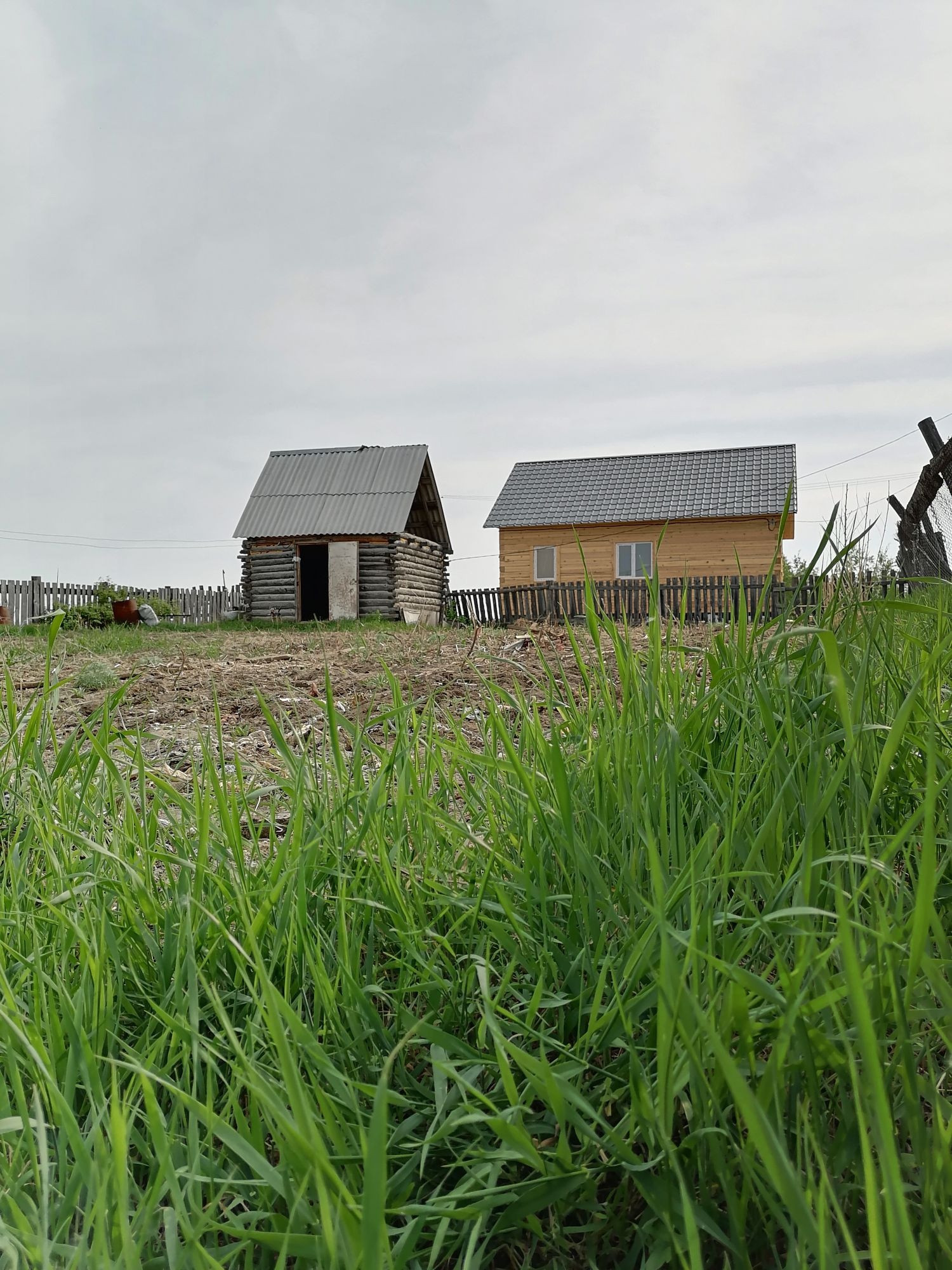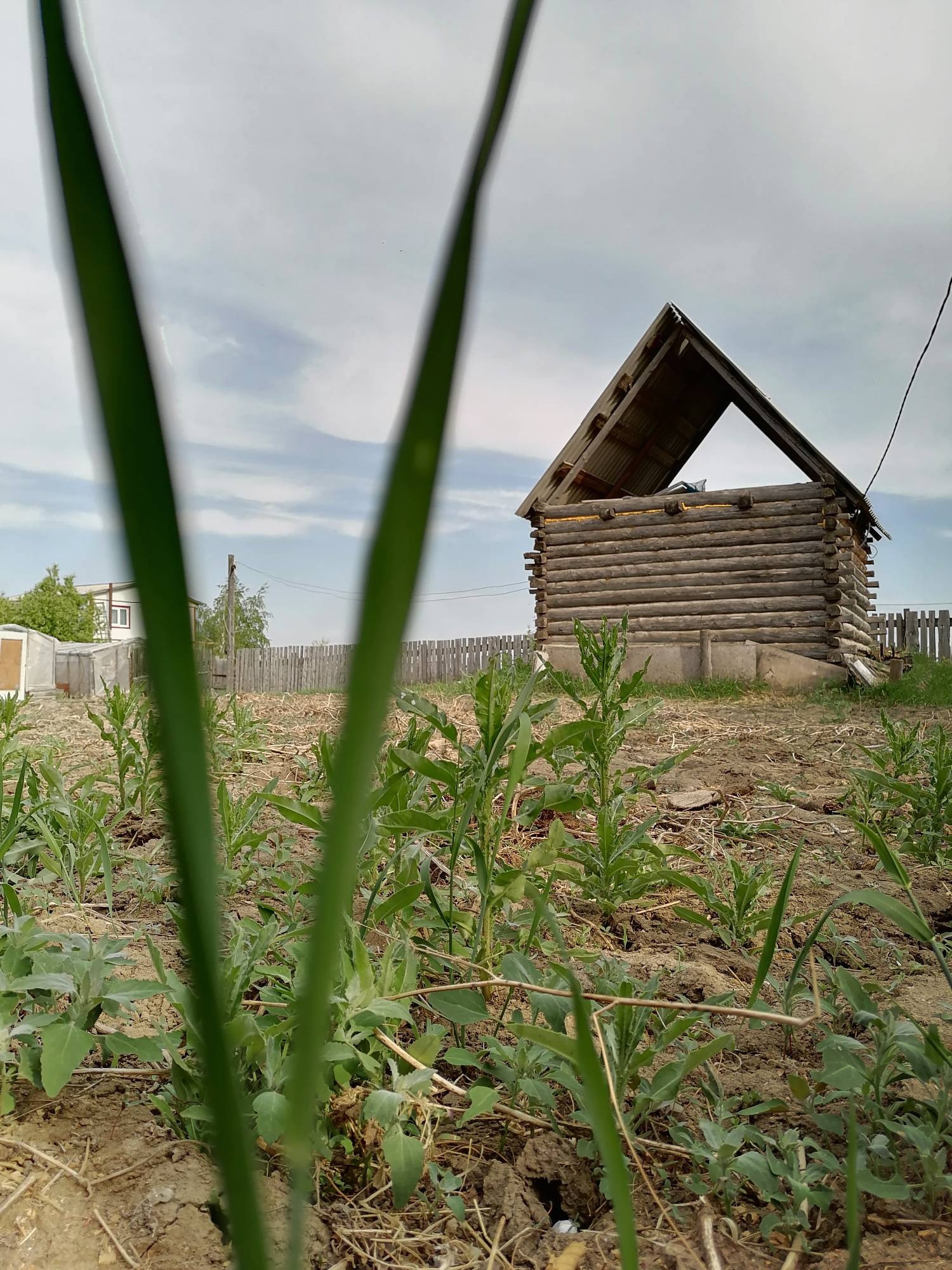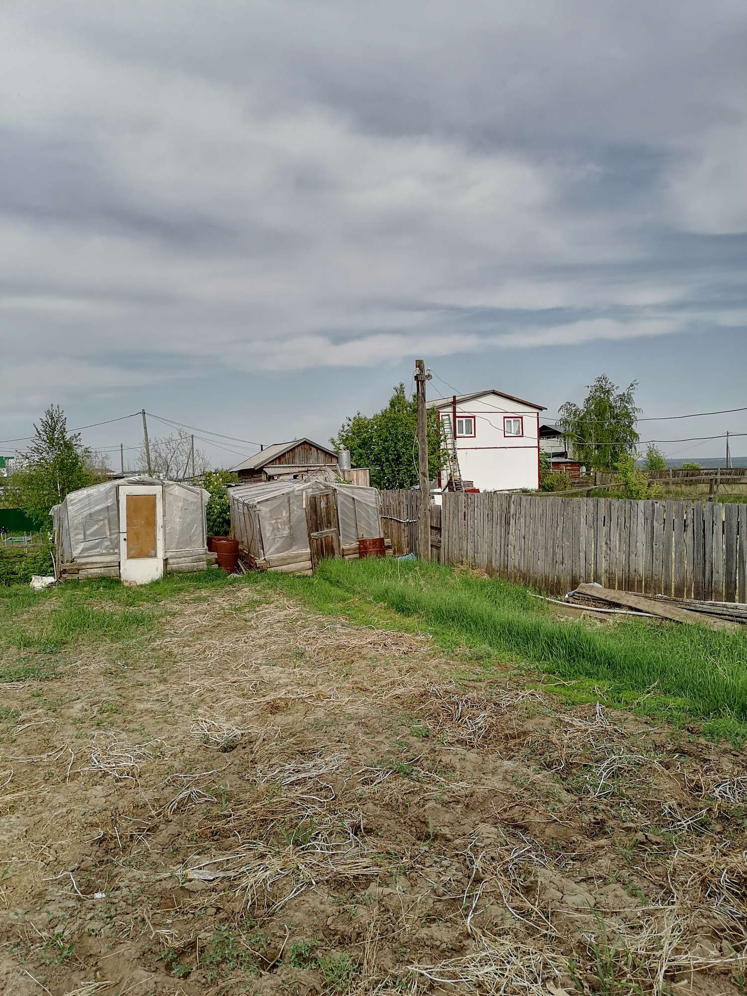 Домик, строительный материал, две теплицы, грядки.