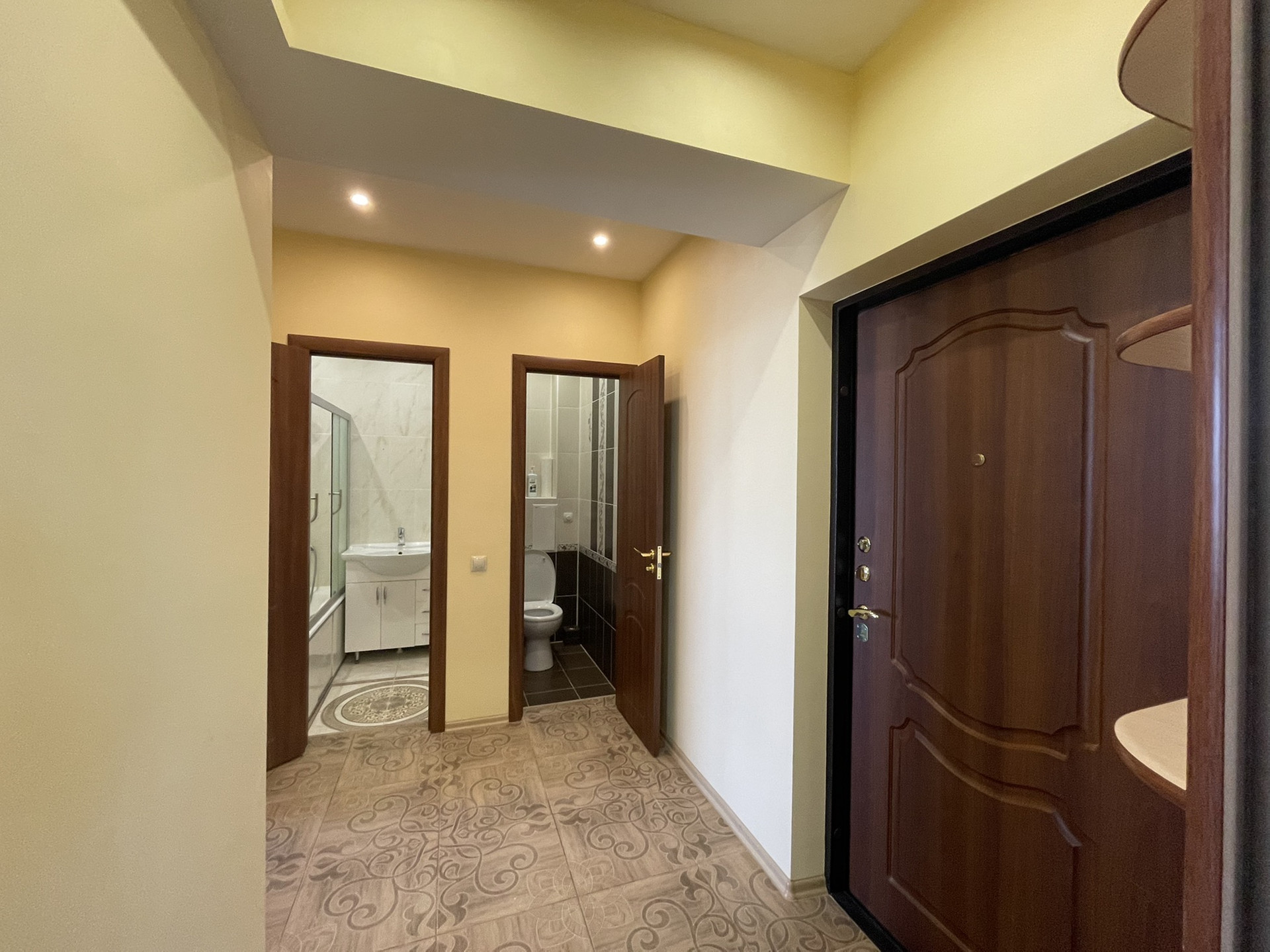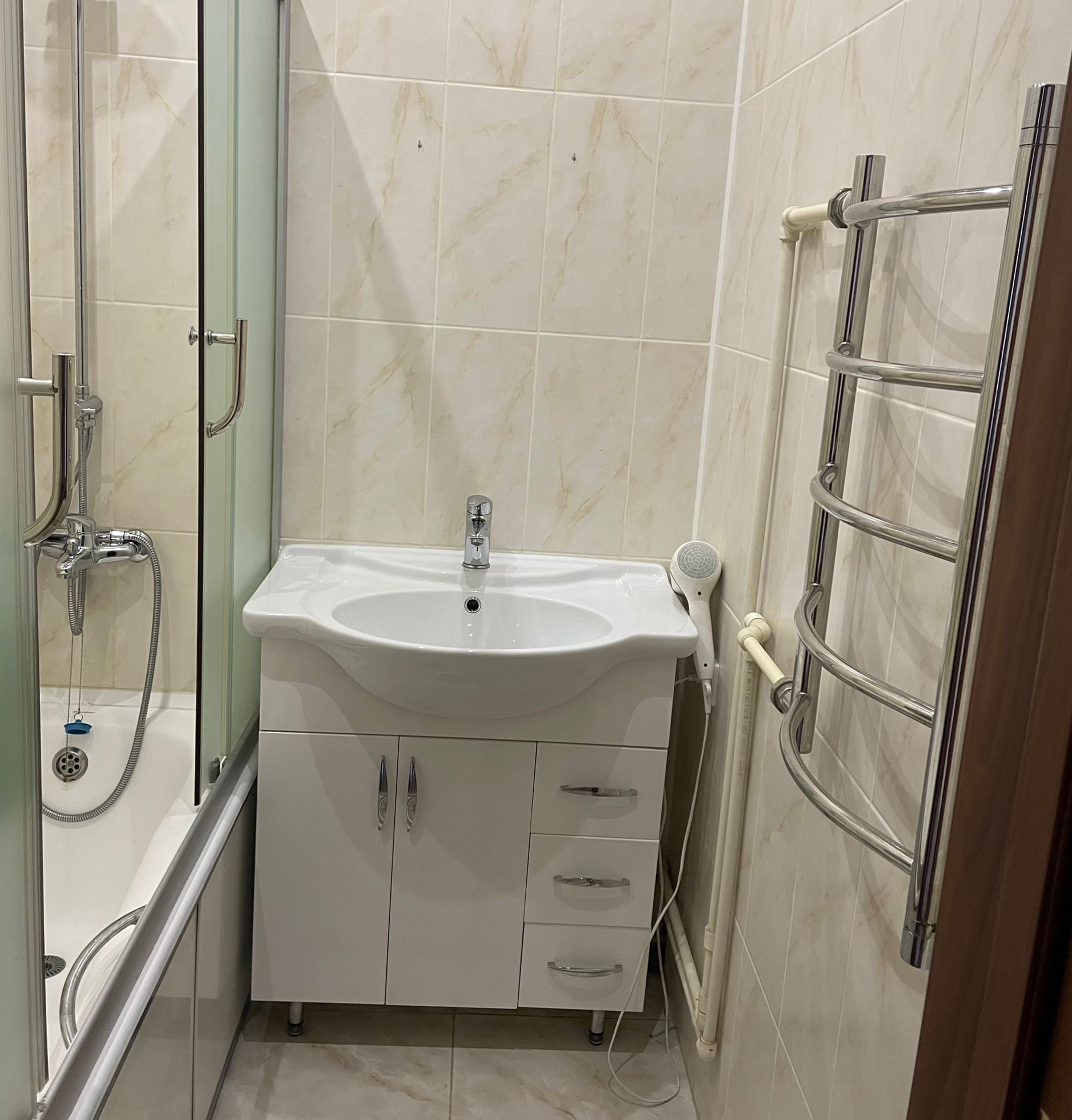 Санузел раздельный с принудительной вентиляцией, чугунной ванной с раздвижными стеклянными шторками, раковиной с тумбой.