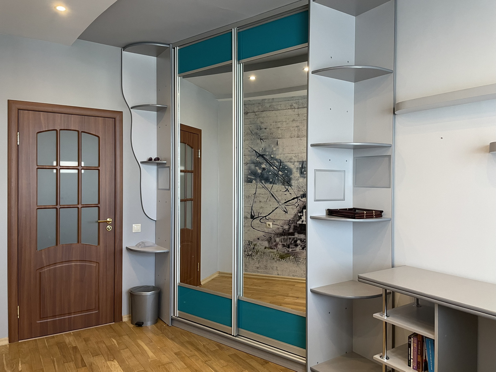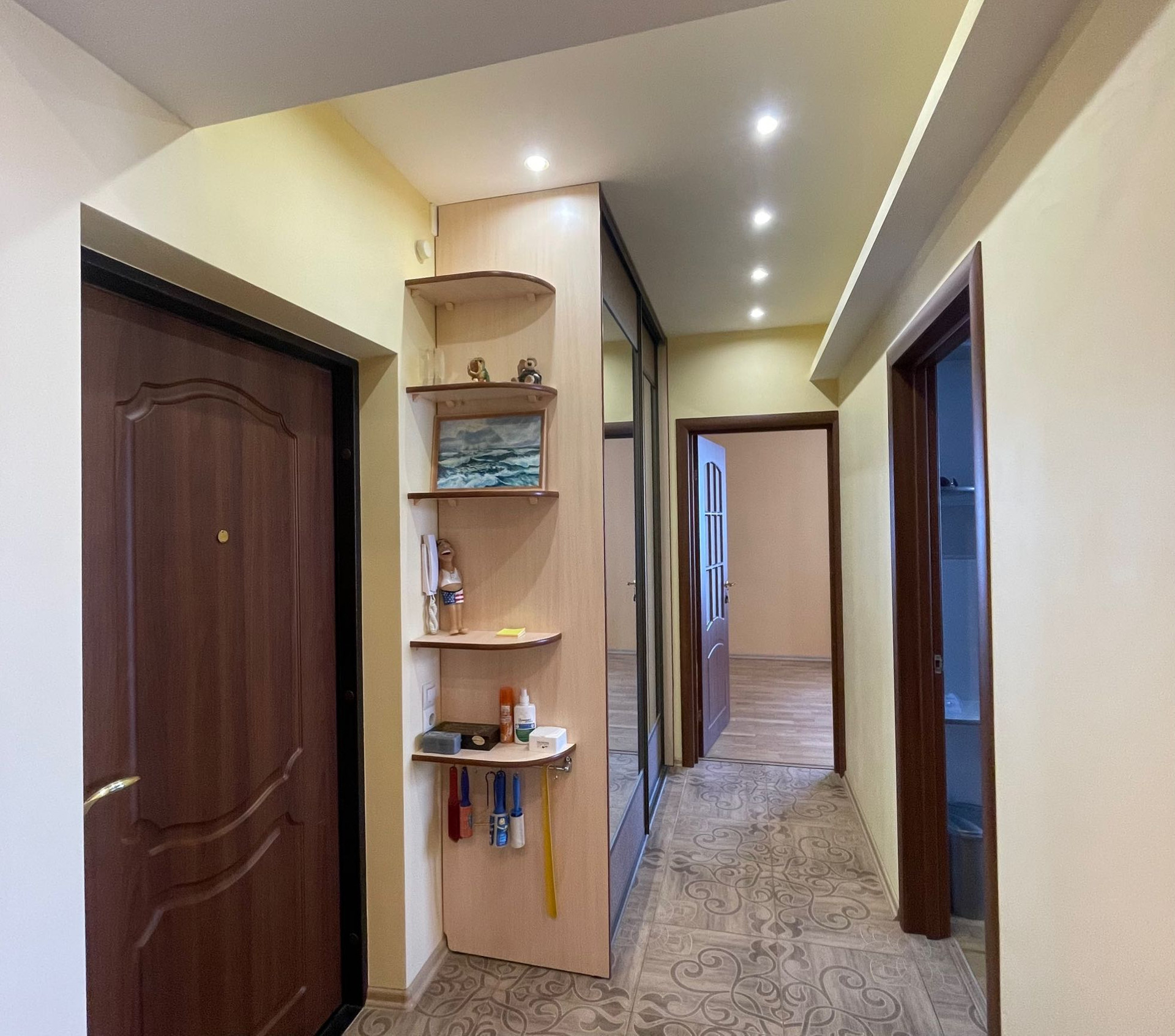 В квартире остаётся встроенная мебель, итальянский кухонный гарнитур из массива ясеня с варочной панелью, каменной раковиной и 3-режимной вытяжкой, в спальных комнатах уложен паркет из дуба, в других комнатах - керамогранит, полы со звукоизоляцией, стены выкрашены моющейся краской.