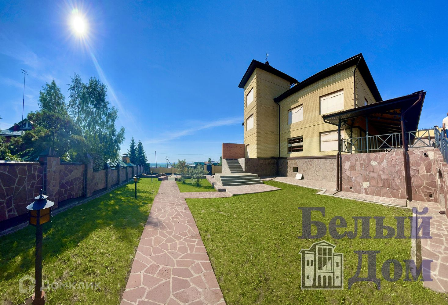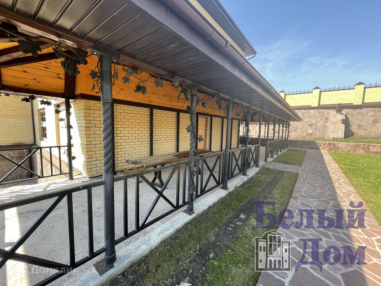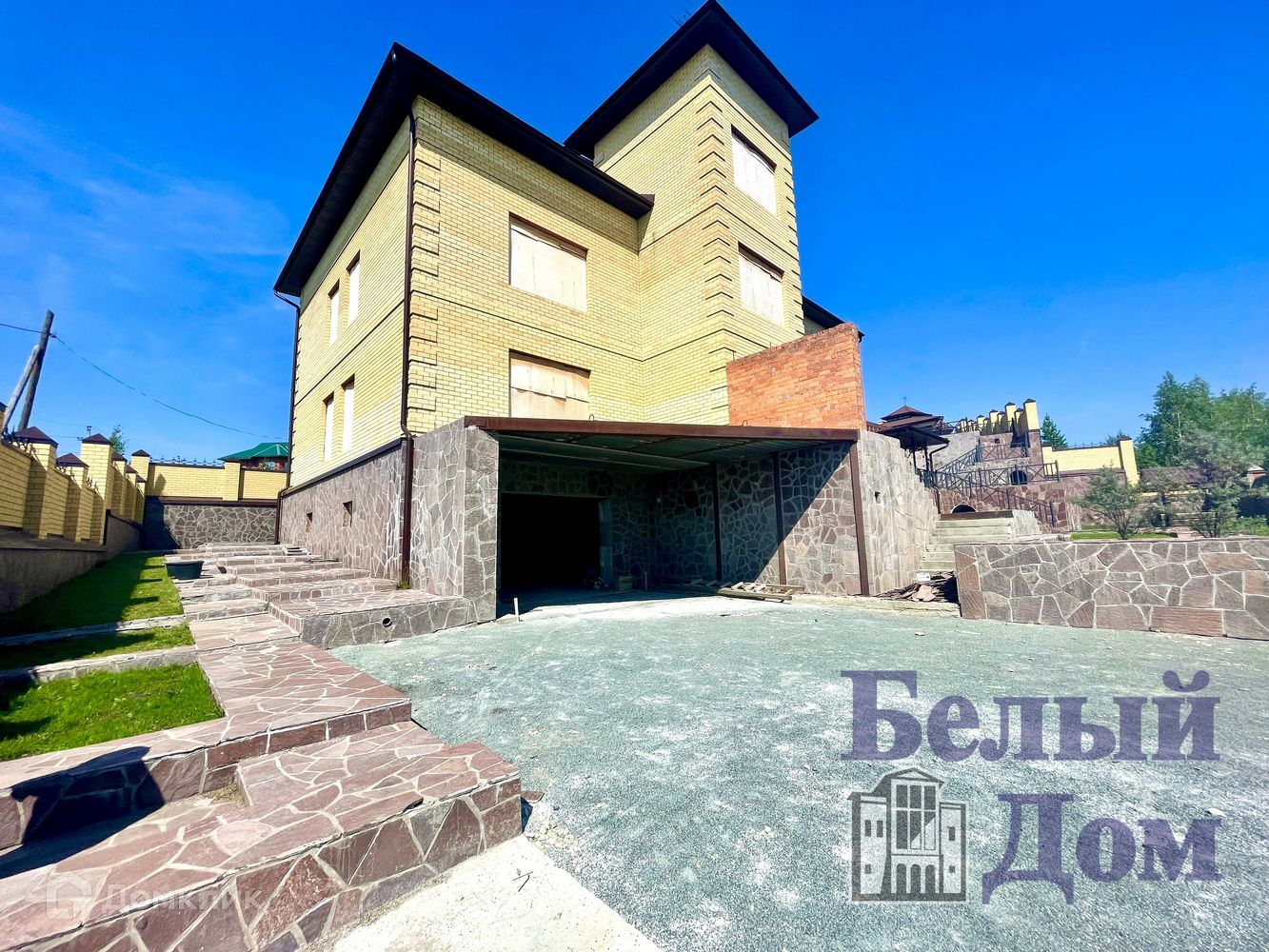 Участок огорожен высоким забором из кирпича с воротами.