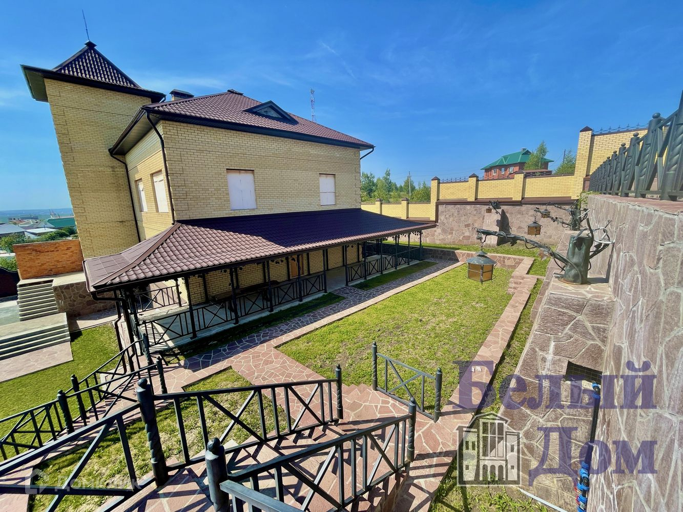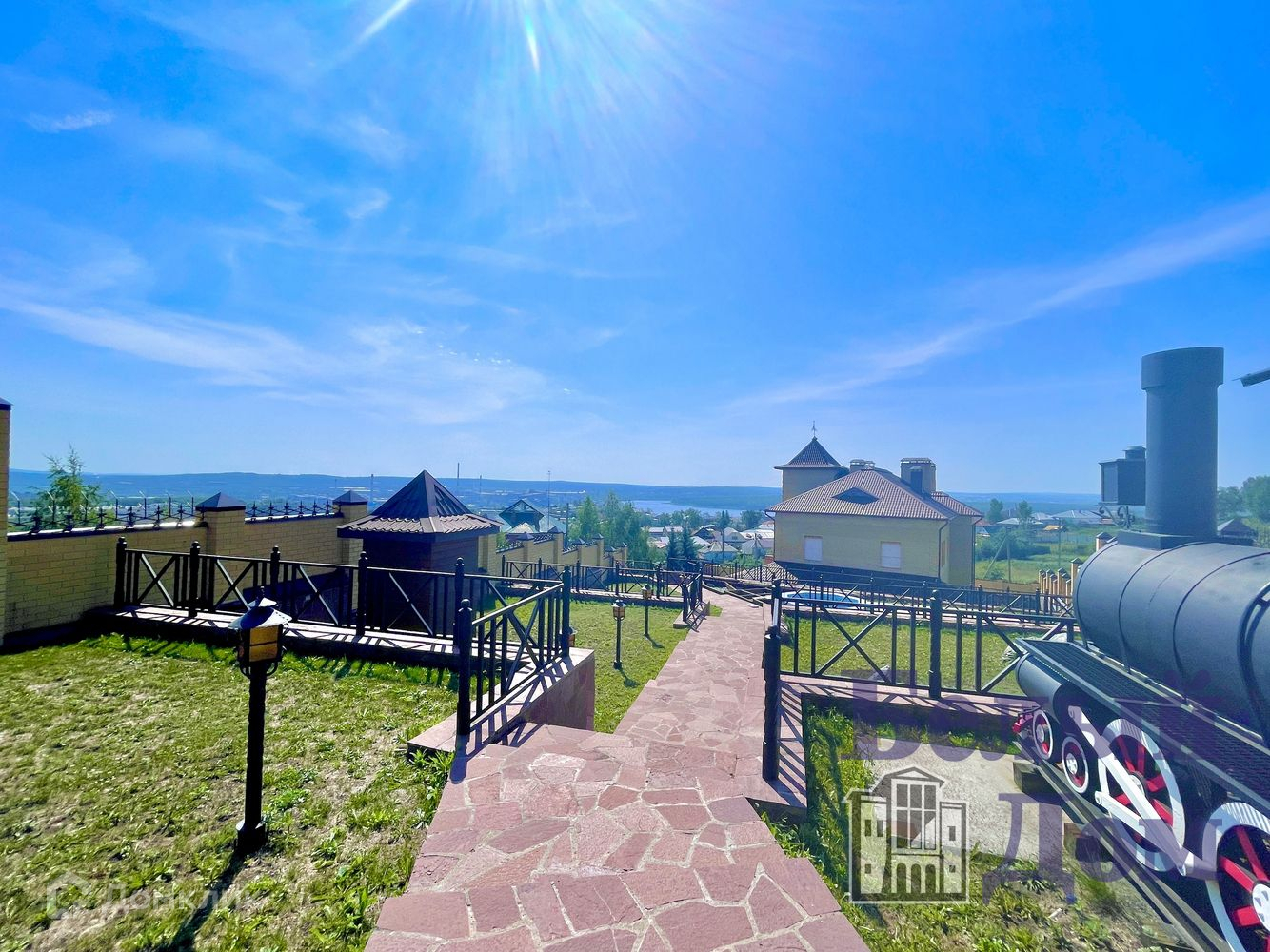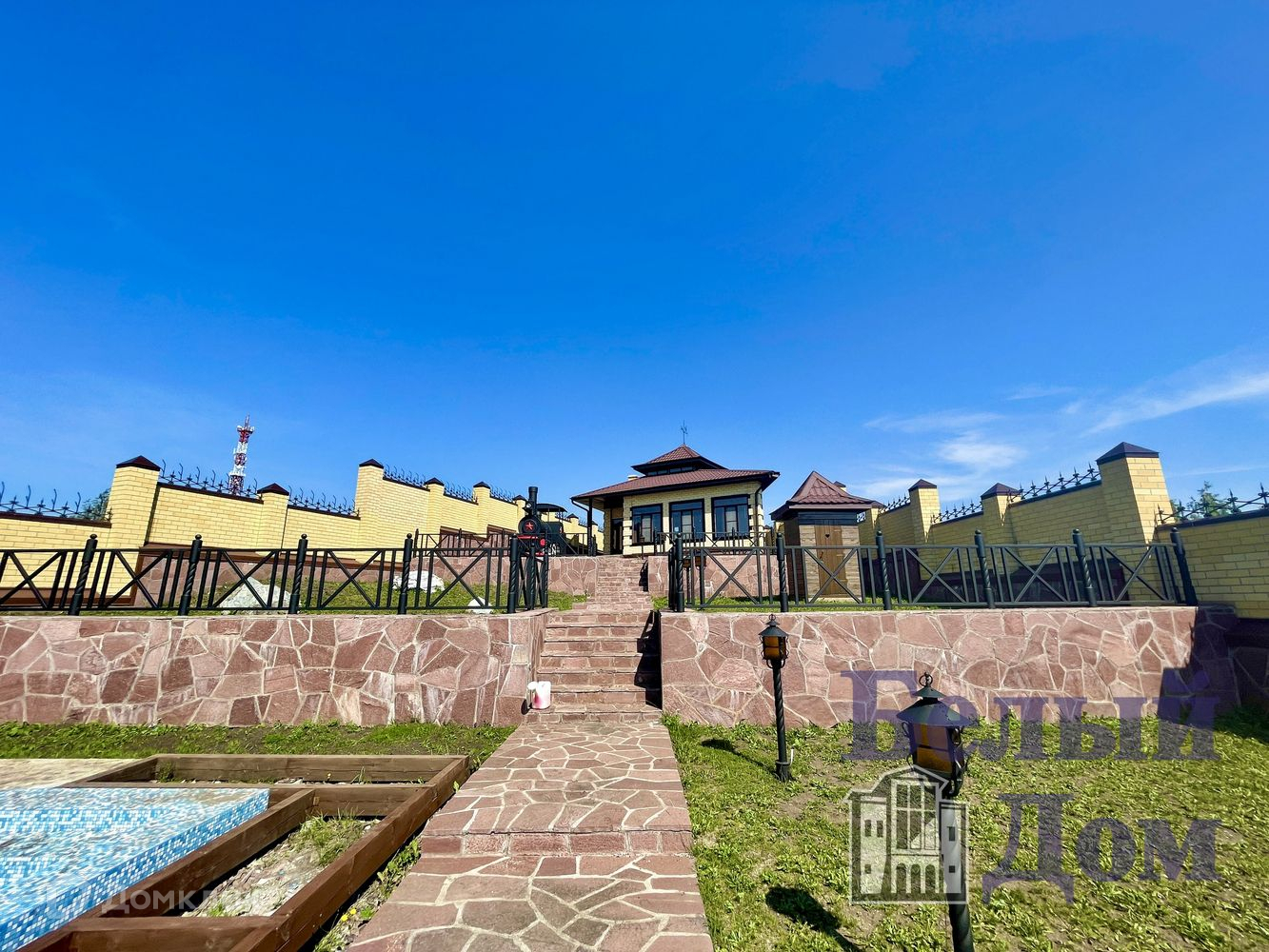 На территории площадка в 3 уровня, дом с трассой, бассейн, теплая беседка с кухней. Дополнительно гараж на два маш. места.