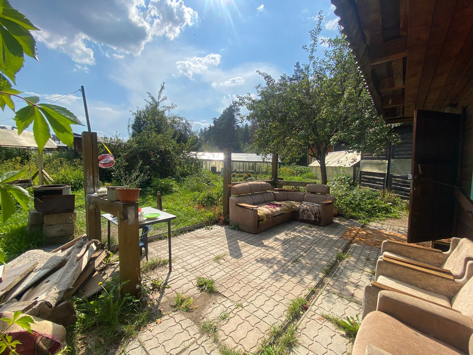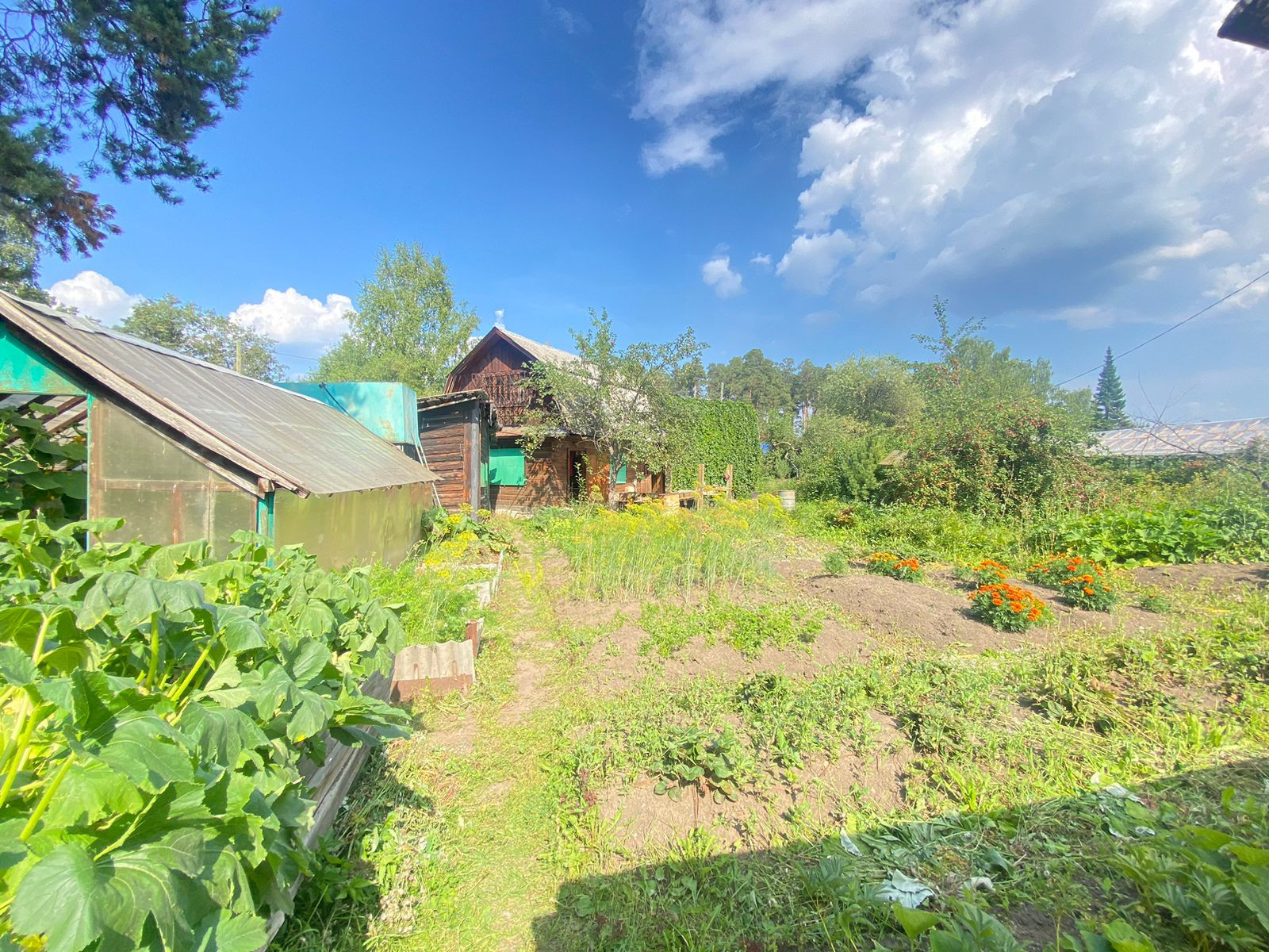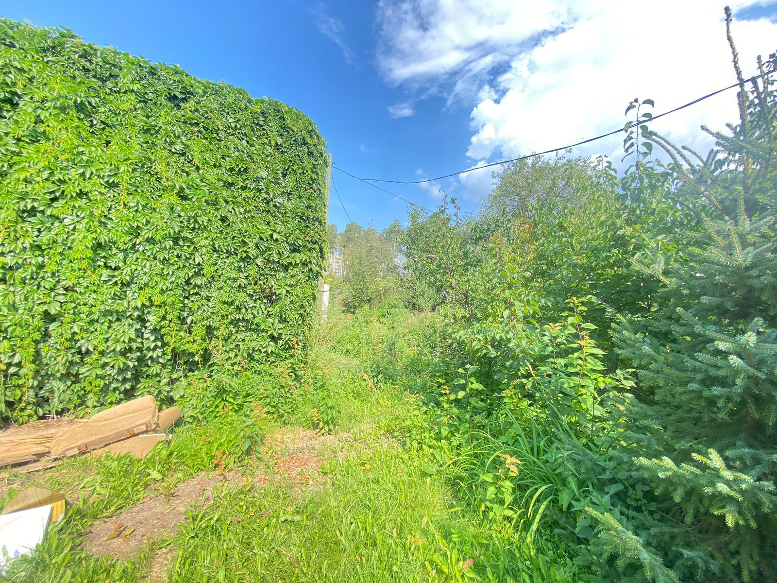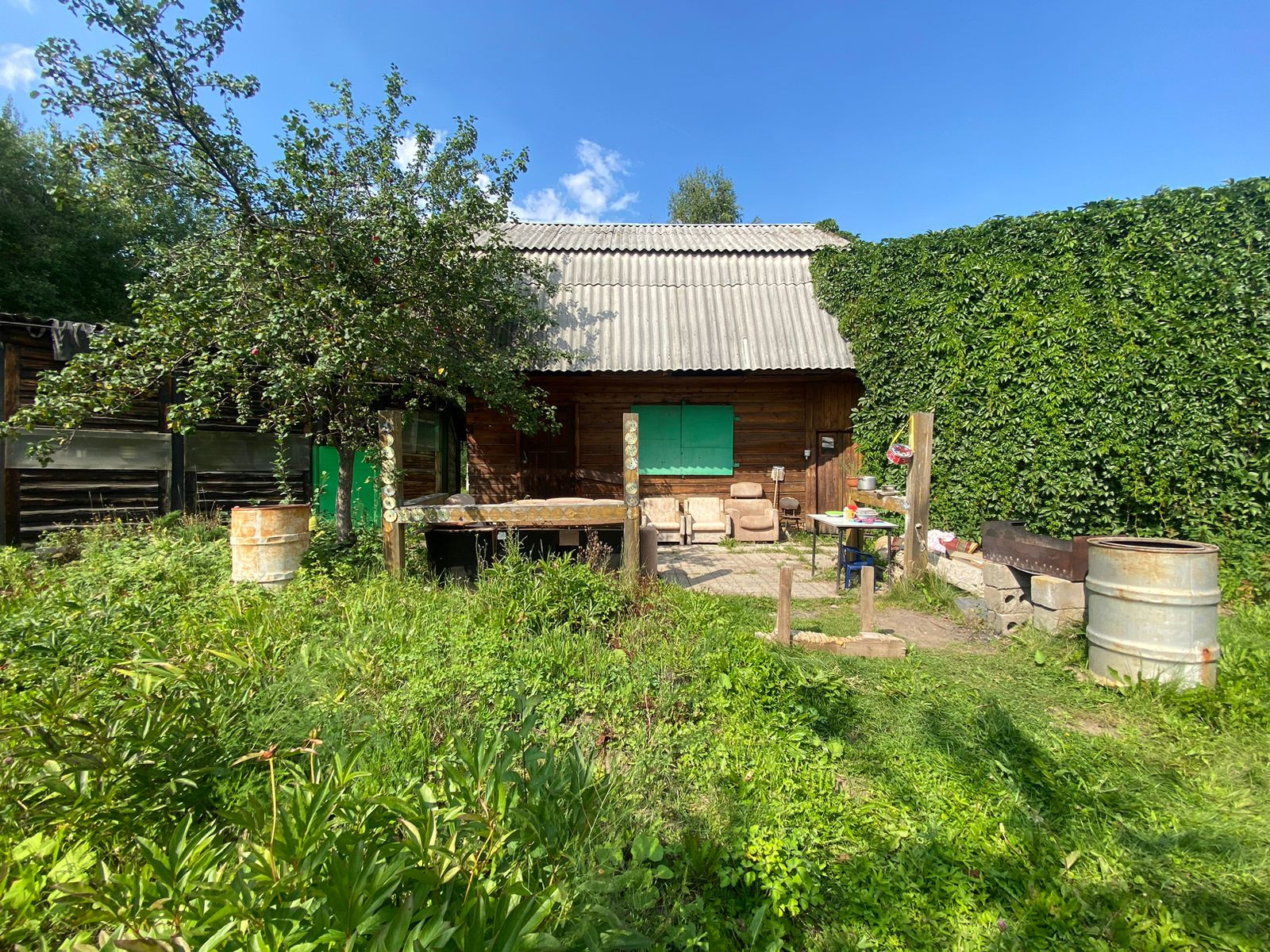 Из насаждений: яблони, крыжовник, смородина, жимолость,Ель голубая,зеленая изгородь из многолетнего дикого винограда.