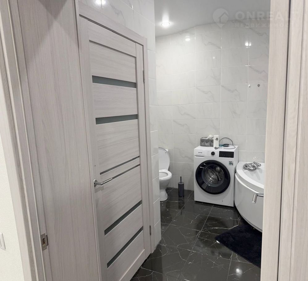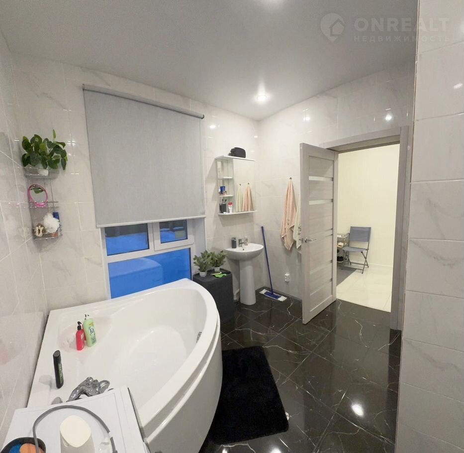 Большой санузел совмещен, большая акриловая ванна, умывальник, унитаз, стены выложены кафельной плиткой, натяжной потолок, на полу кафельная плитка и теплый пол, установлена стиральная машина-автомат.