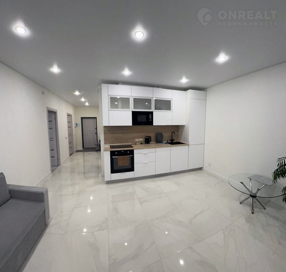 Кухня-гостиная площадь 20,79 кв.м. с выходом на летнюю террасу площадью 18 кв.м., встроенный кухонный гарнитур со встроенной современной бытовой техникой (посудомоечная машинка, духовой шкаф, варочная панель, микроволновая печь), натяжной потолок, на полу кафельная плитка с теплым полом, новый диван 2-х спальный.