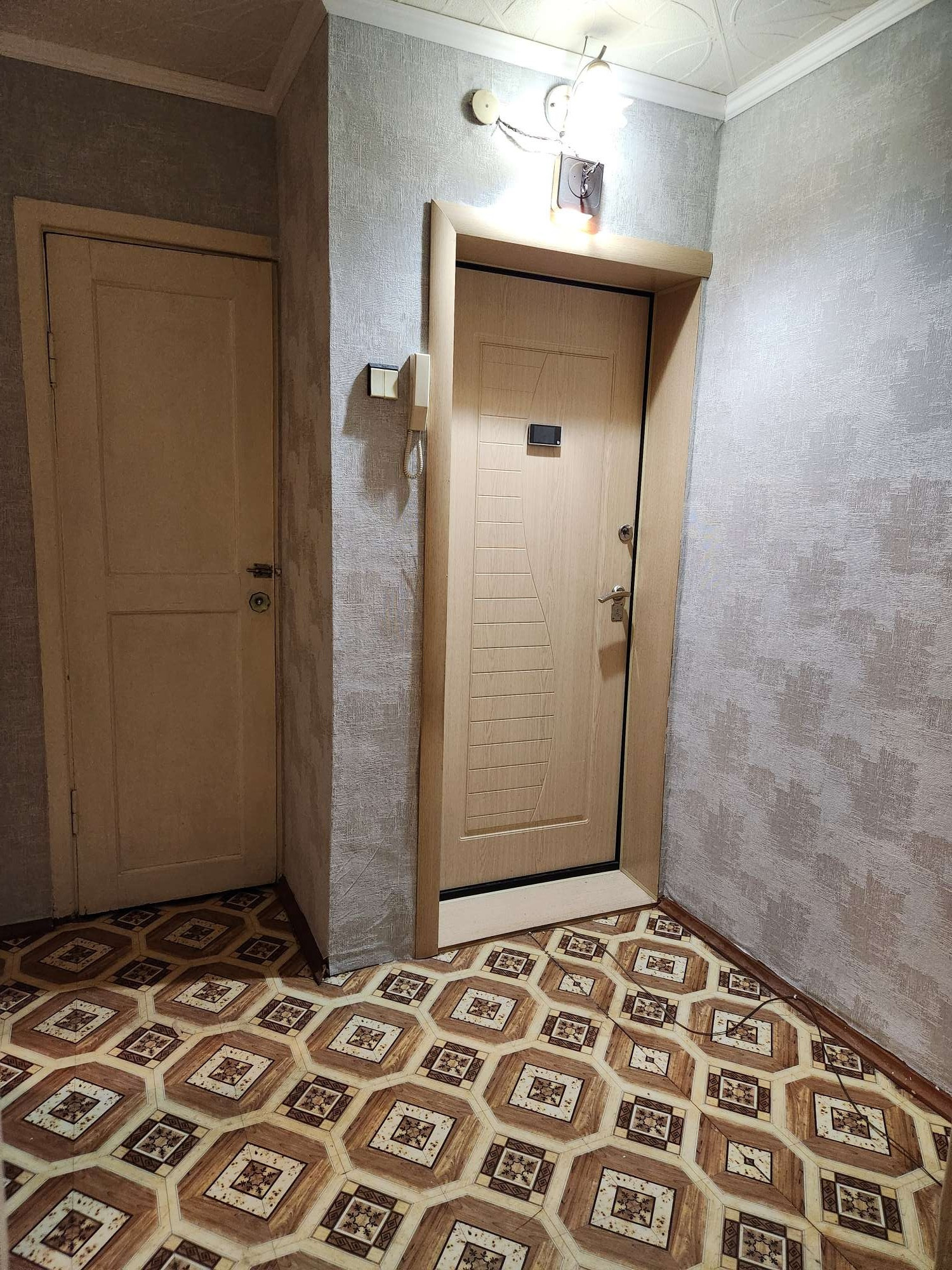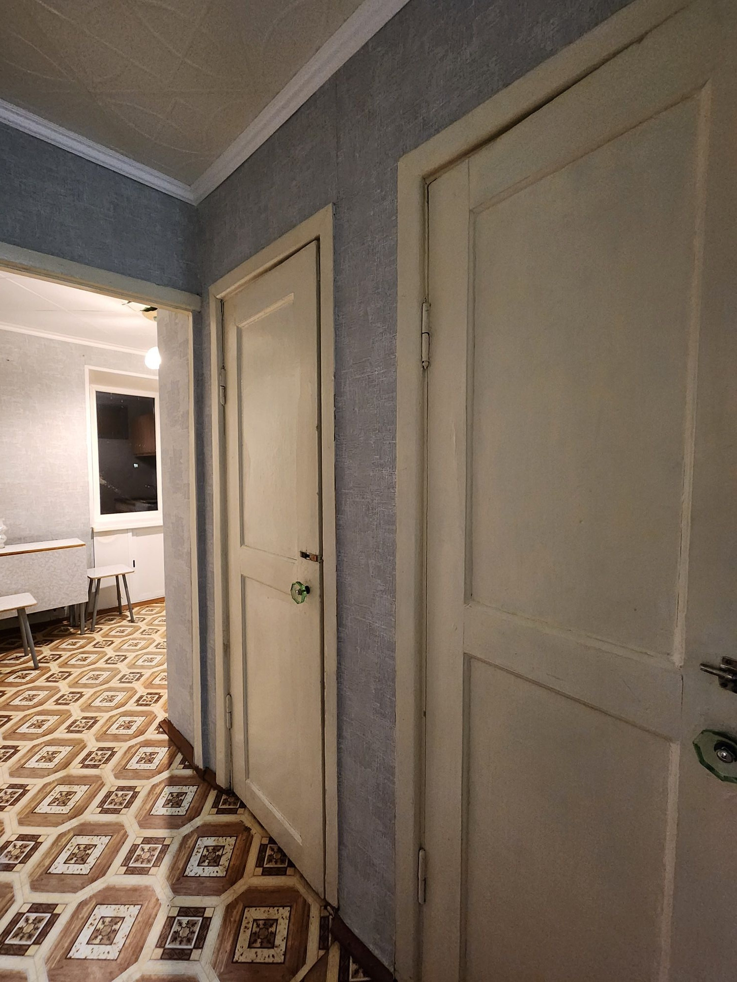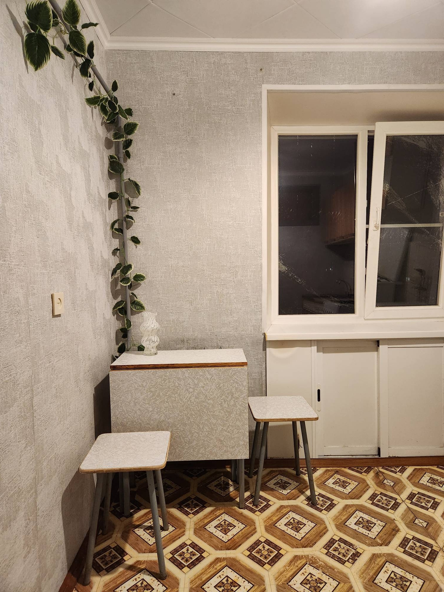 окна везде пластиковые, на полу линолеум (макс на кухне можно освежить, след от старого холодильника-видно на фото, но в целом везде хороший без прорывов). Балкон обшит снаружи, застеклен окнами из алюминиевого профиля. Дверь входная с видео глазком, обзор площадка целиком.