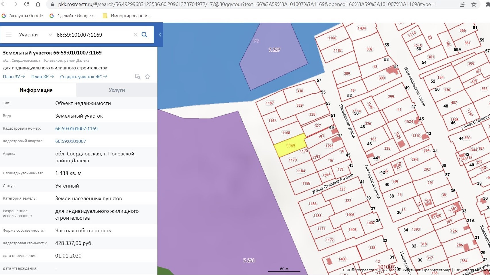 В продаже земельный участок прямоугольной формы, кадастровый номер: 66:59:0101007:1169. Категория земель: земли населенных пунктов, вид разрешенного использования: для индивидуальной жилой застройки, границы определены (отмежеван). Расположен в районе «Далека». Проезд до нашего участка: улица Пионерская 41 — поворот налево (ул. Степана Разина), в гору. Район начал активно застраиваться два года назад, электричество проведено, газ — за забором (на ул. Пионерской), ждём когда Администрация сделает дороги)))