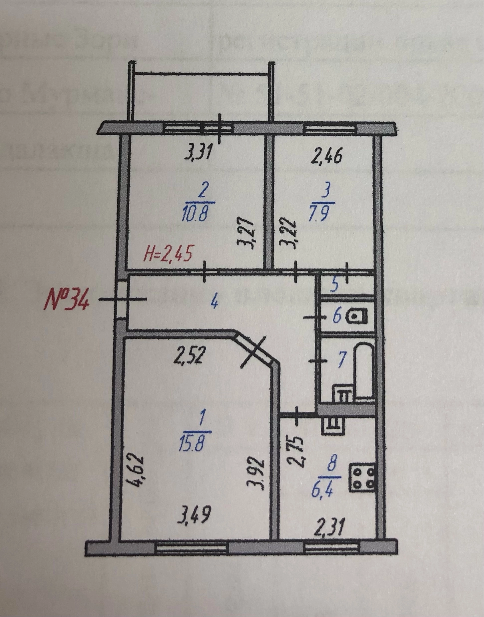 Жилая площадь 34.5 м2