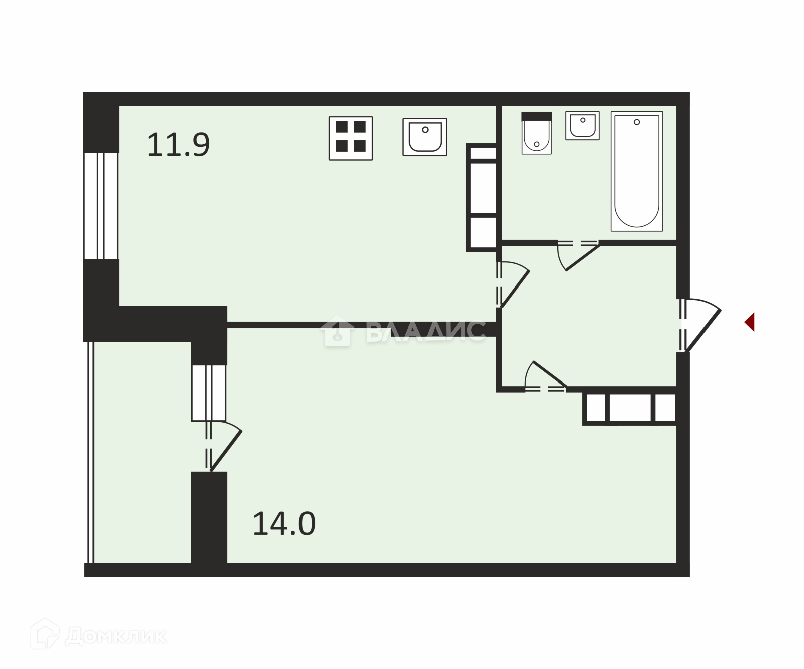 Общая площадь 33.2 м2