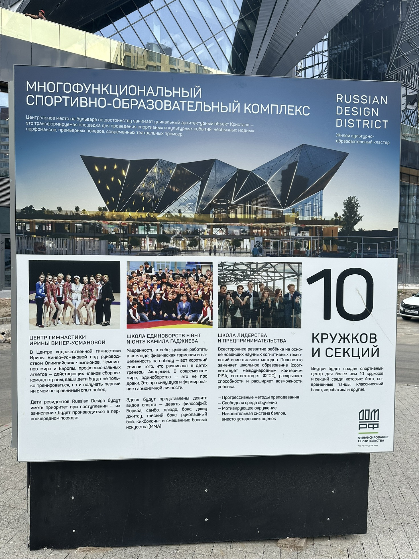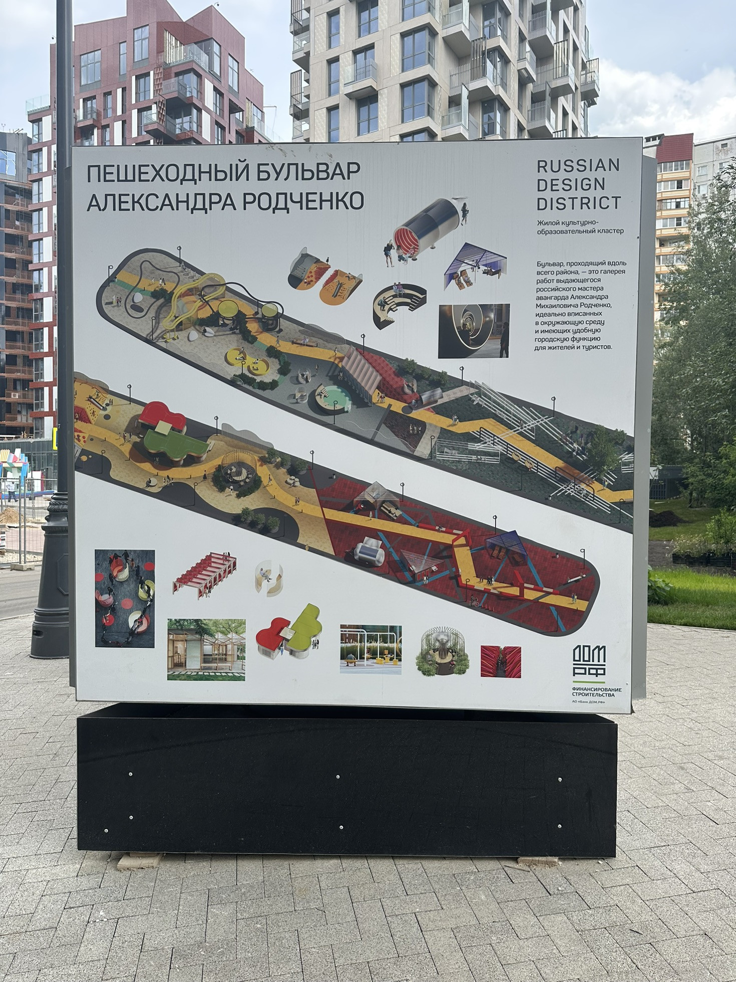 Russian Design District на берегу реки Десны рядом с большой лесопарковой территорией площадью 14 гектаров со спортивной и детской инфраструктурой, с футбольными, волейбольными, хоккейными площадками, памп-треками, беговыми дорожками и пространством для отдыха и прогулок. Данный ЖК обладает уникальной инфраструктурой: школа дизайна и технологий, академия моды, школа единоборств FIGHT NIGHTS, арт галерея под открытым небом, прогулочные зоны. Вся необходимая инфраструктура рядом - детские сад, школа, медицинский центр внутри ЖК. На первых этажах комплекса находятся коммерческие помещения: супермаркеты, аптеки, кофейни, салоны красоты.