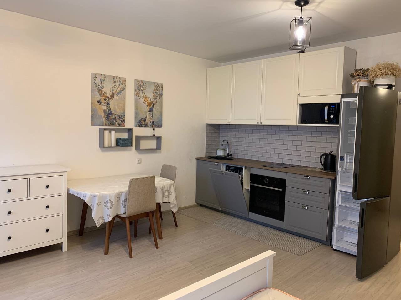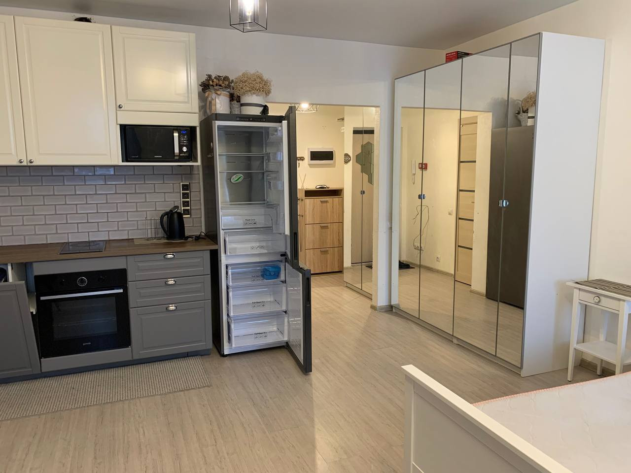 Продается квартира-студия. Удобное расположение дома относительно основной дороги, внутренний двор без машин, подземный паркинг. Район с развитой инфраструктурой, в ближайшее время будет метро. Детские сады, школы, поликлиника в пешей доступности. В квартире остается кухня (кухонный гарнитур ikea, духовой шкаф gorenje, индукционная плита delonghi, посудомоечная машина bosch, холодильник Samsung)