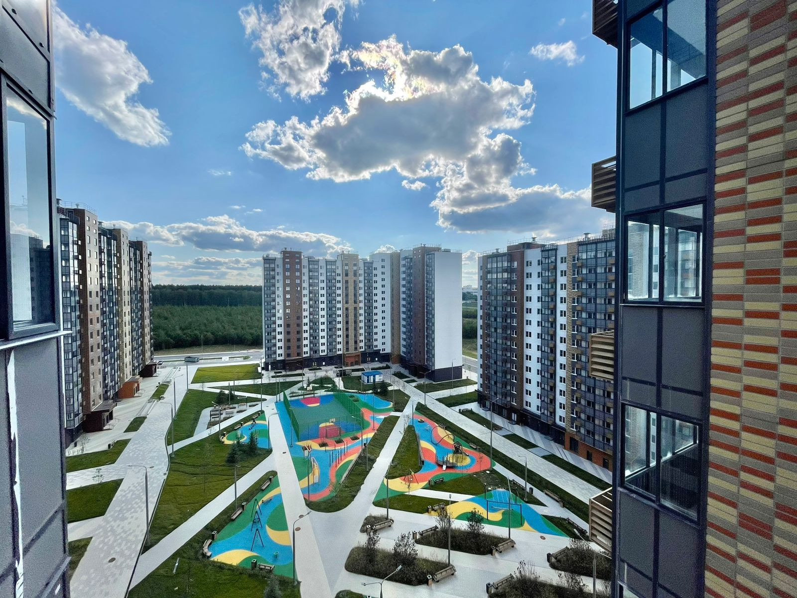Ландшафтный двор с детскими и спортивными площадками. Детский сад с бассейном и школа уже построены и введены в эксплуатацию.