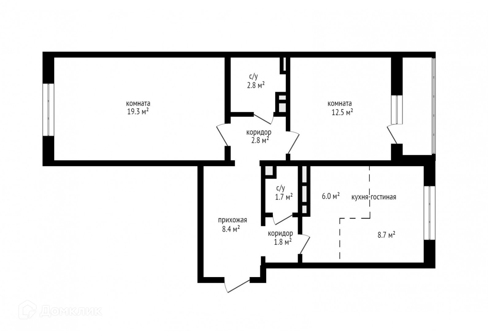 Окна квартиры на две стороны- распашонка,  комнаты 19 и 12,5 метров, кухня -гостиная 15 метров.