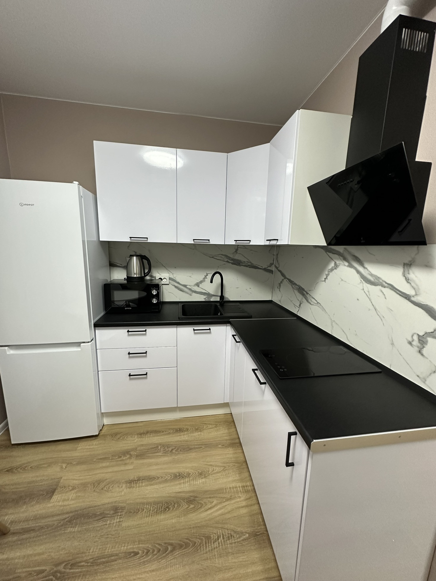 - Кухонный гарнитур с плитой, вытяжкой и холодильником