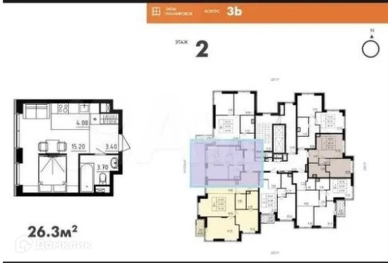 В продаже 1-комнатная квартира, площадью 26,3 кв.м. в корпусе 3Б.