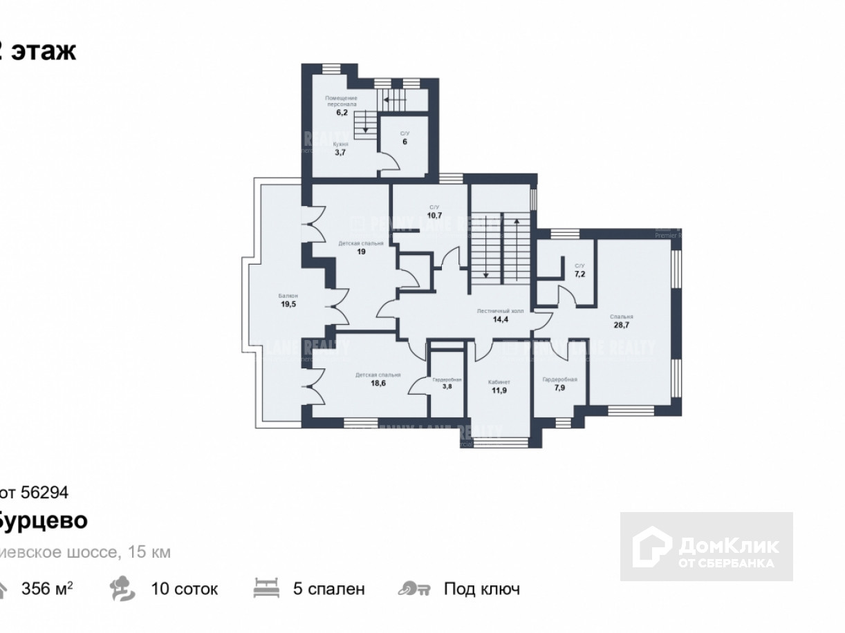 2 этаж: хозяйская спальня с гардеробной с будуаром и с/у, две спальни с гардеробными, ванная, кабинет/спальня, 1 балкон.
