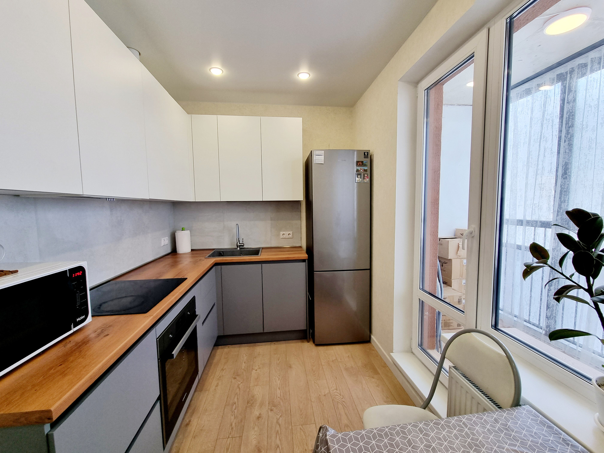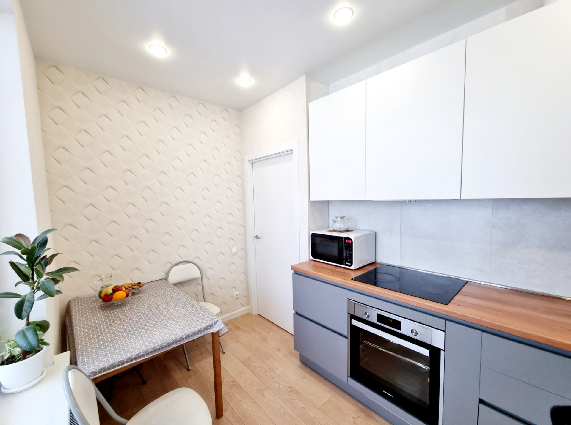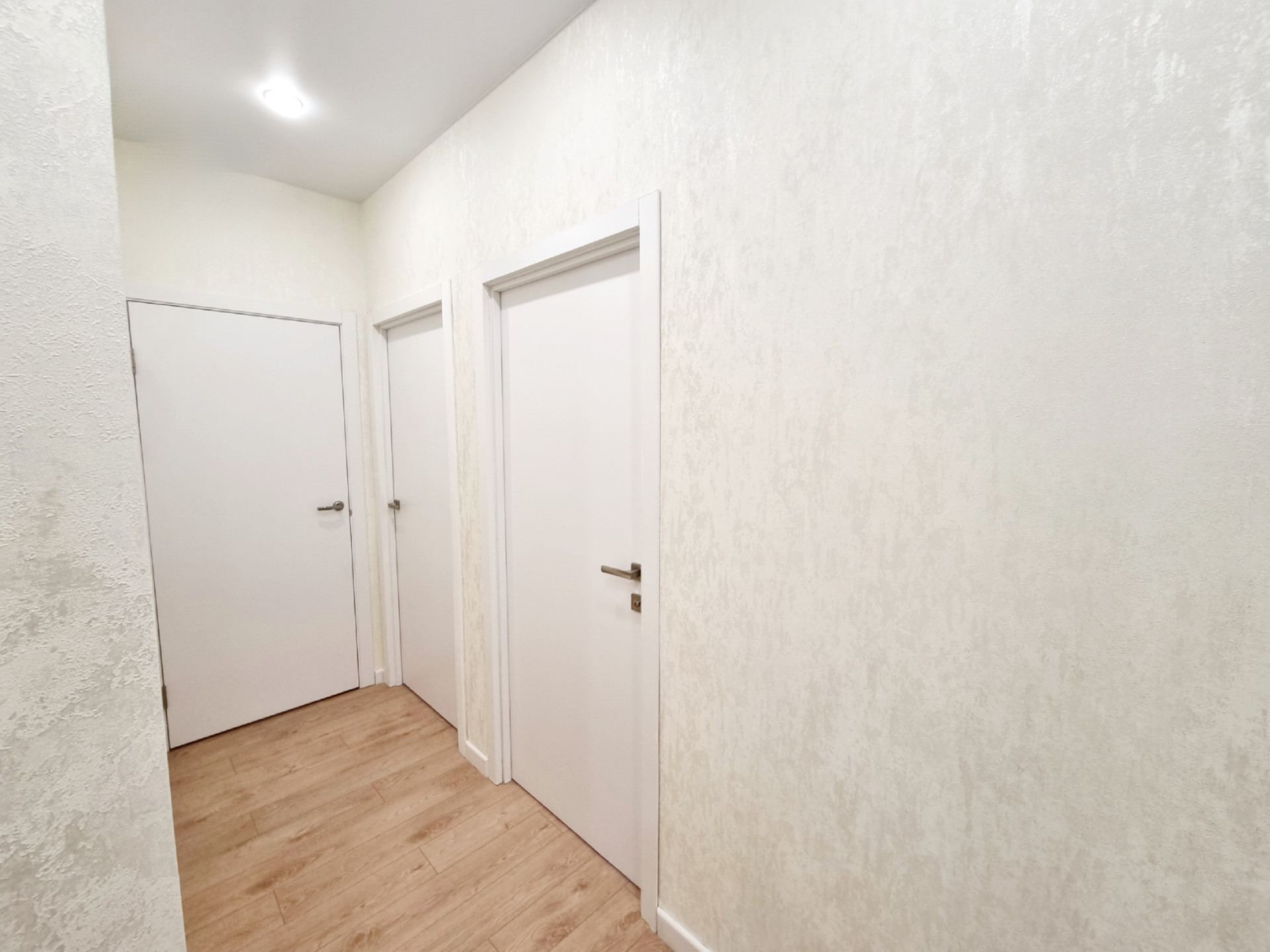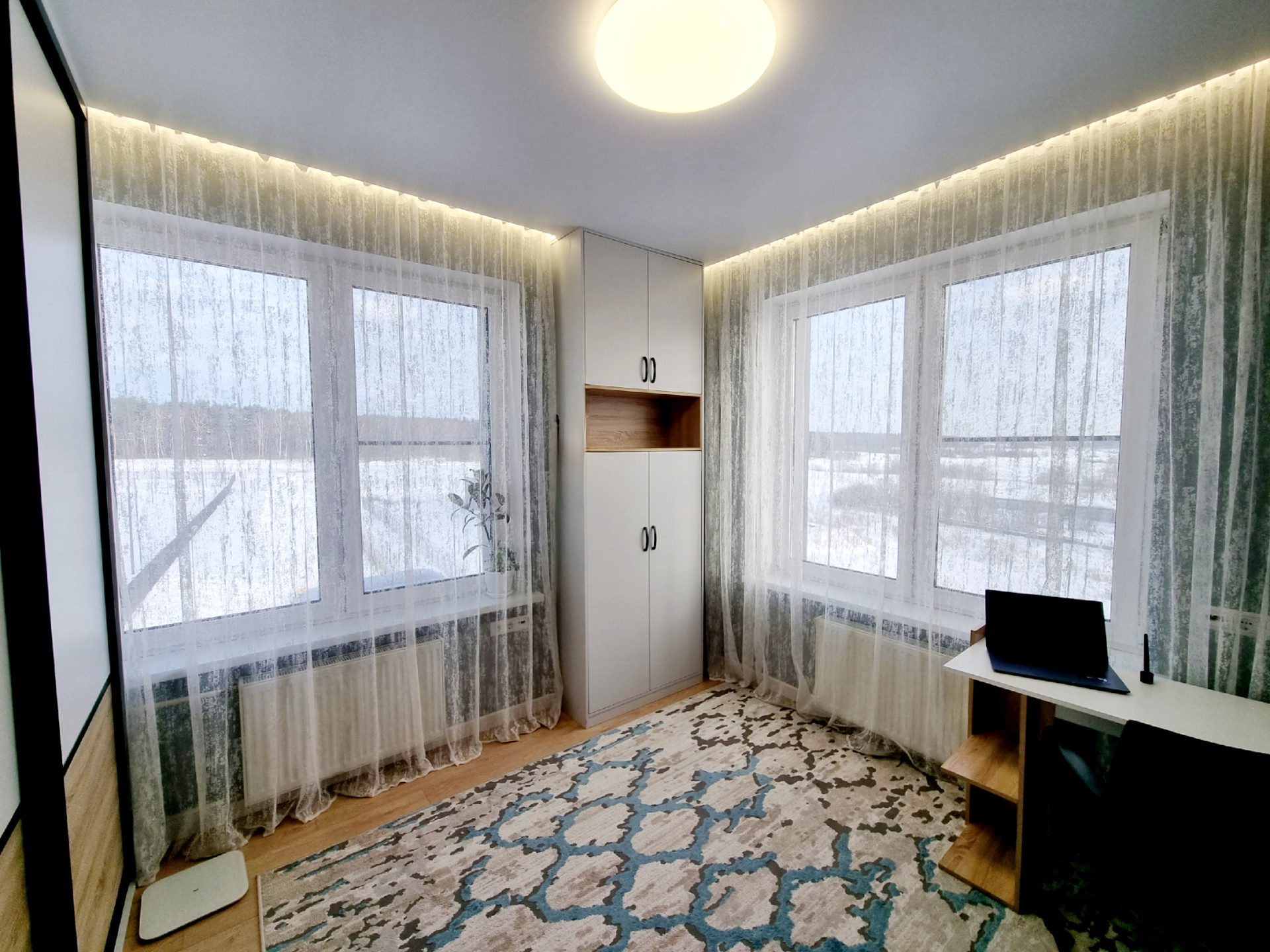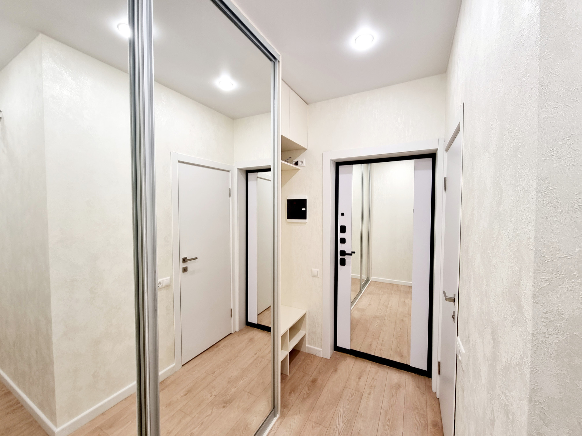 В квартире выполнен качественный ремонт, в светлых тонах. Увеличенные окна делают ее еще более светлой. На полу - ламинат повышенной влаго- и износостойкости и керамогранит, натяжные потолки, в комнатах над окнами люминесцентная подсветка и дополнительно точечные светильники у шкафов. Возможна продажа с мебелью и техникой.