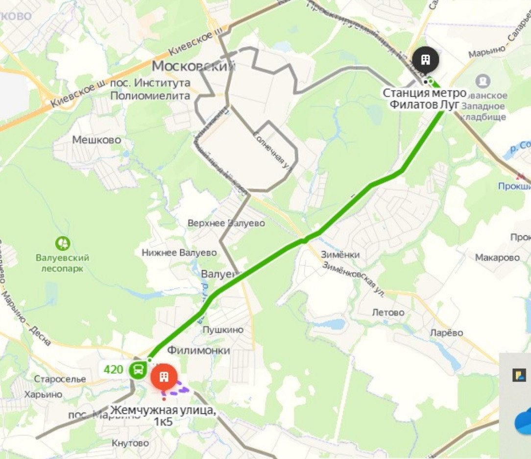 Ближайшее метро - Филатов Луг, красная линия метро. На автобусе № 420 (ходит каждые 5-10 мин) от дома до метро ехать всего 12-15 минут!