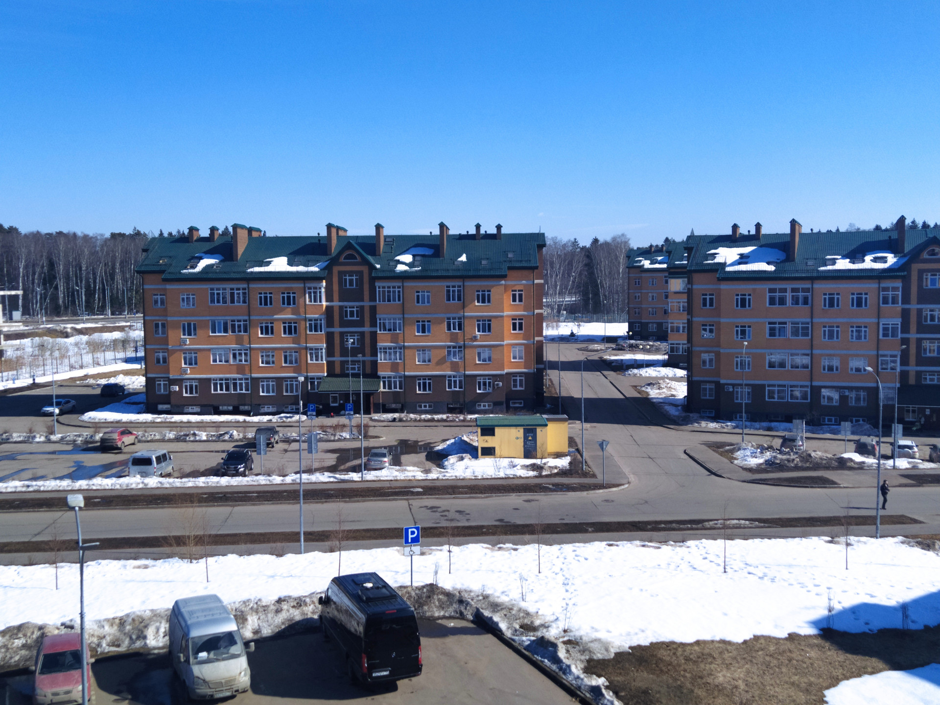Дома малоэтажные, много места для парковки, детские площадки, баскетбольная и футбольная площадки, места для отдыха, прямой выход в лес и к реке.