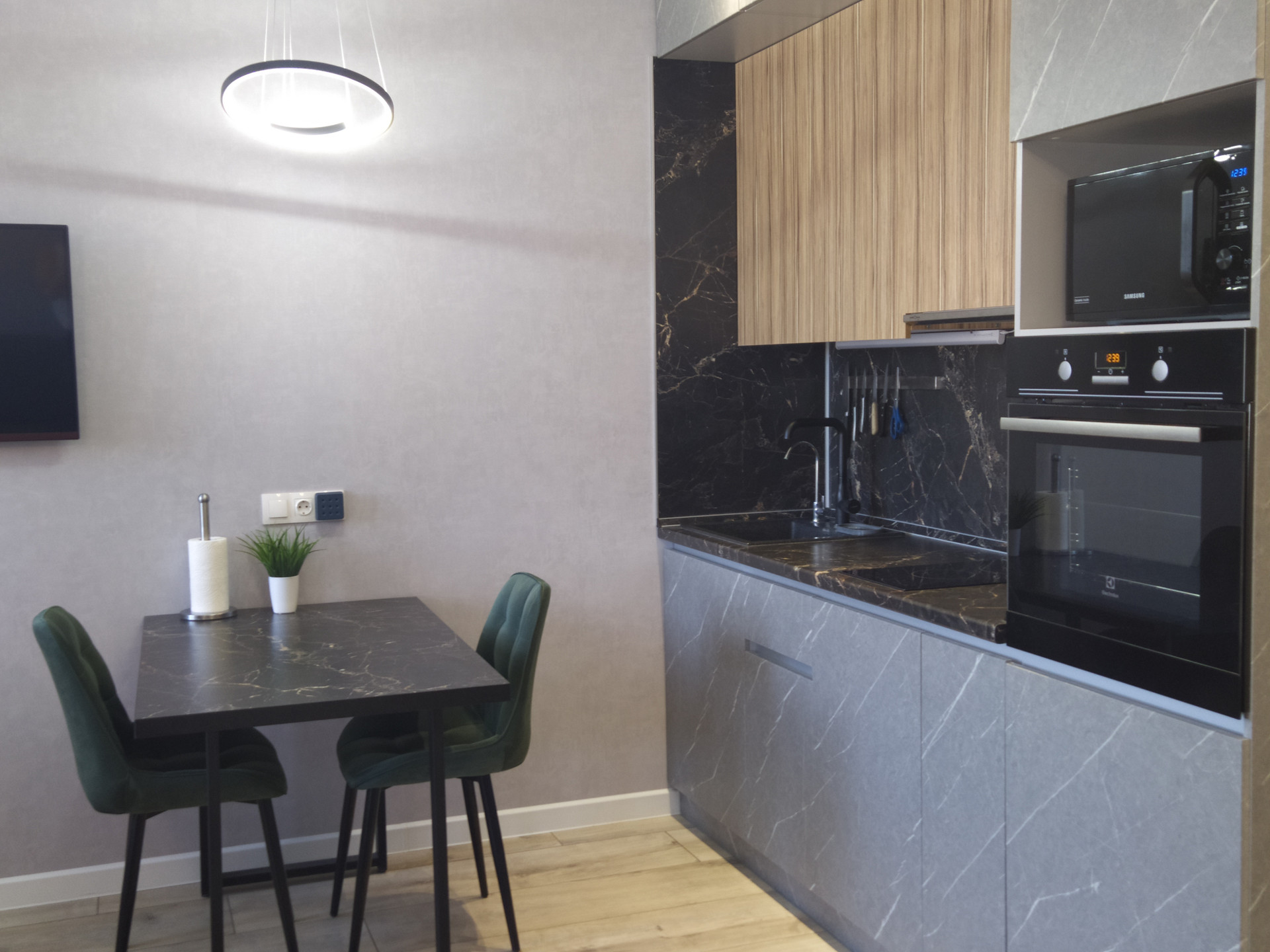 Сделан хороший ремонт, использованы качественные материалы. Нейтральная цветовая гамма природных оттенков, благодаря чему в квартире очень уютно.