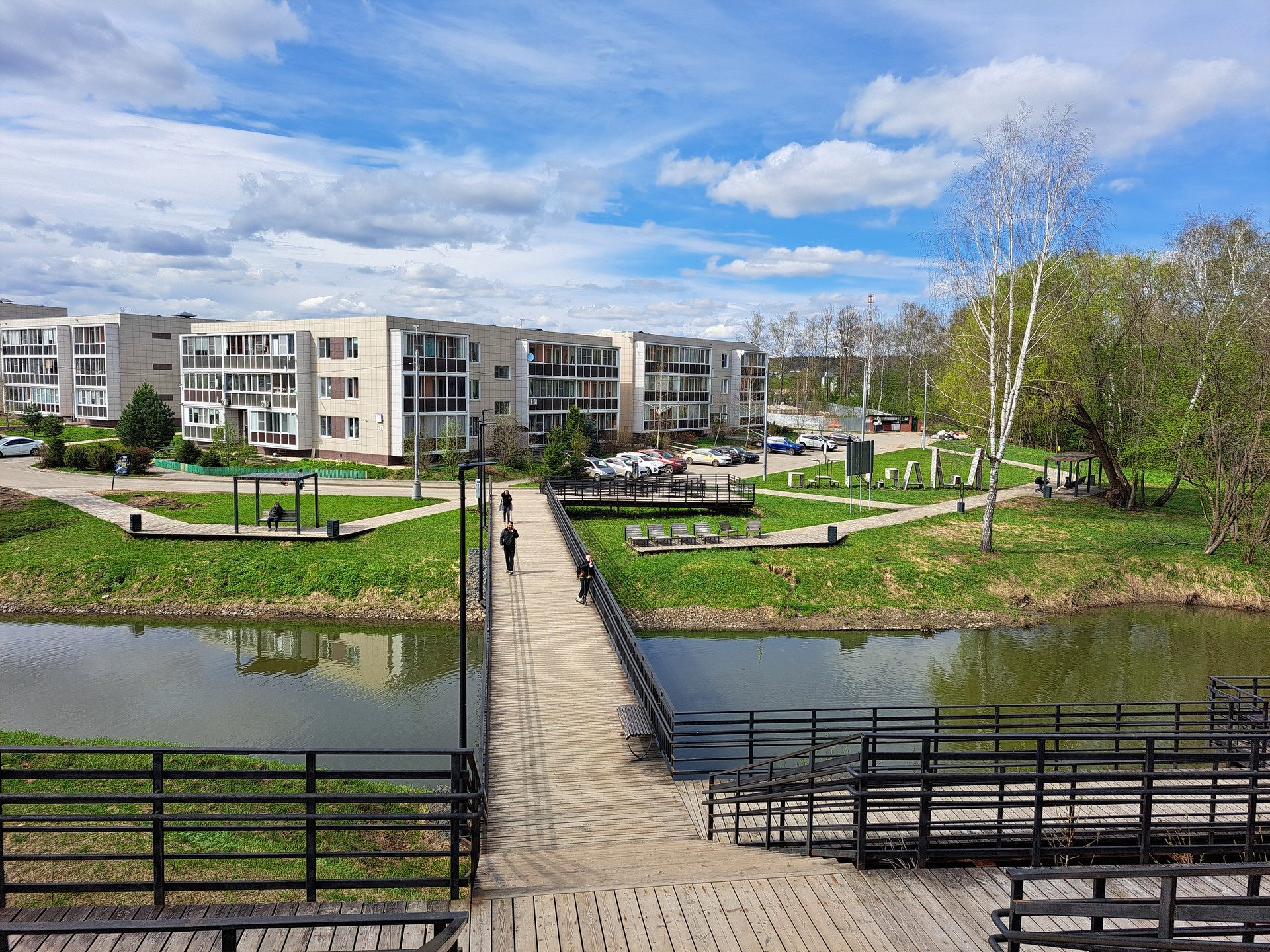 Парковая зона, река с зоной для отдыха.