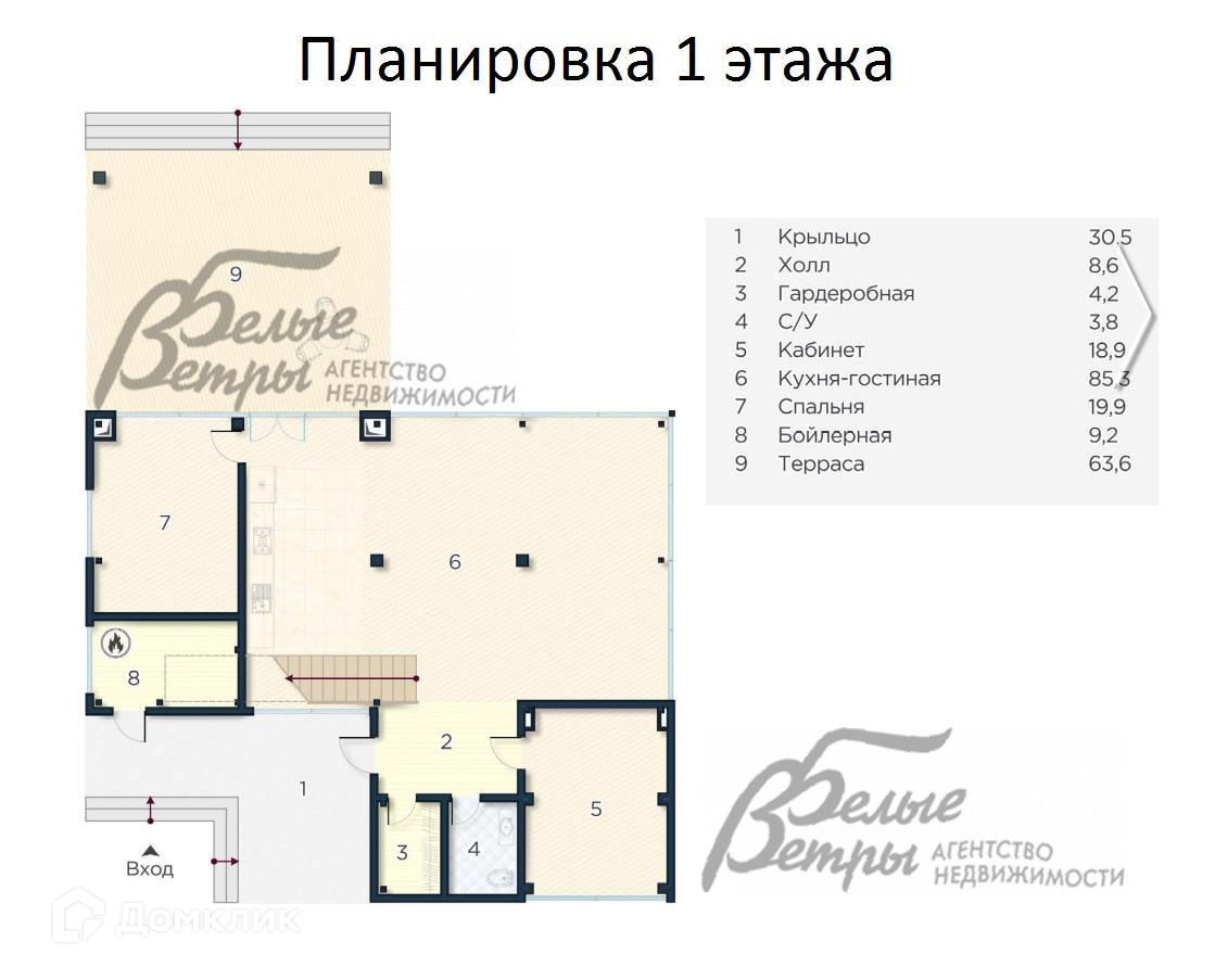 1-ый этаж: крыльцо 31 кв.м, холл 9 кв.м, гардеробная 4 кв.м, санузел 4 кв.м, кабинет (спальня) 19 кв.м, кухня/гостиная 85 кв.м, спальня 20 кв.м, терраса 64 кв.м, котельная 9 кв.м..