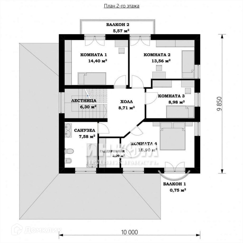 2 этаж: четыре комнаты, три из которых имеют выходы на балконы, гардеробная, санузел.