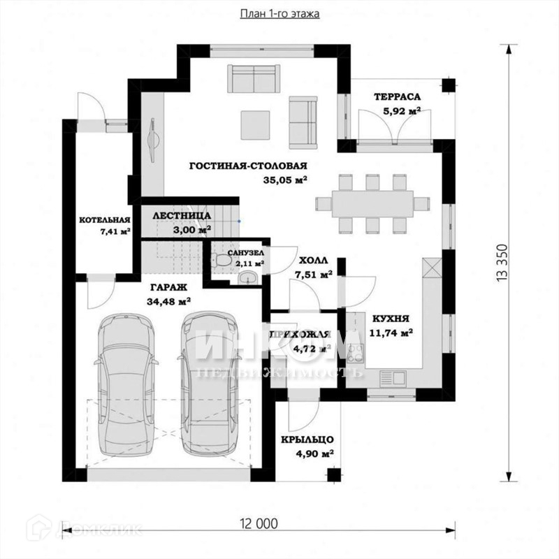1 этаж: кухня-гостиная с просторной террасой, кухня, котельная, санузел, вспомогательные помещения, свободная планировка. Можно обустроить гараж на 2 машины. Высота потолков более 3 м.