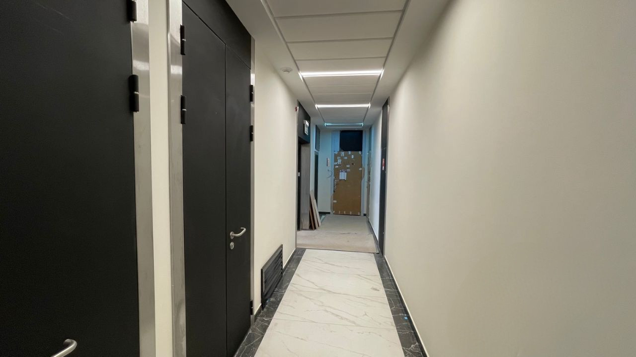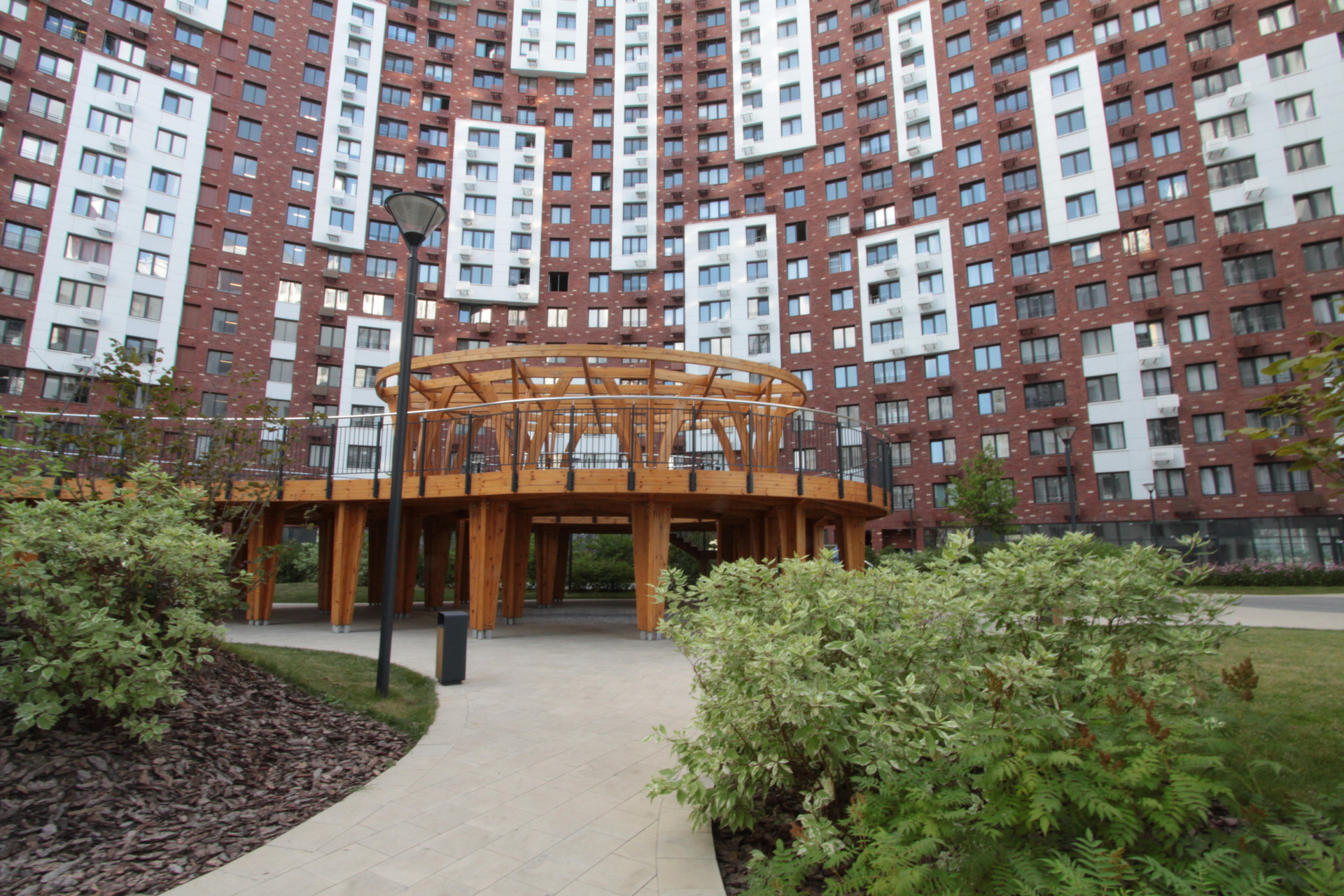 Большой закрытый внутренний двор с ландшафтным дизайном и охраняемой огороженной территорией.