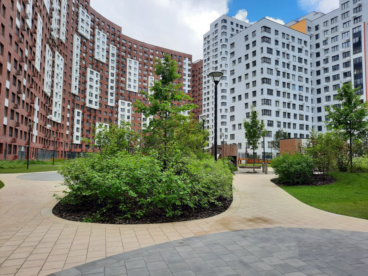 Большой закрытый внутренний двор с ландшафтным дизайном и охраняемой огороженной территорией. Есть детская и спортивная площадки. Все хорошо оборудовано для взрослых и детей.